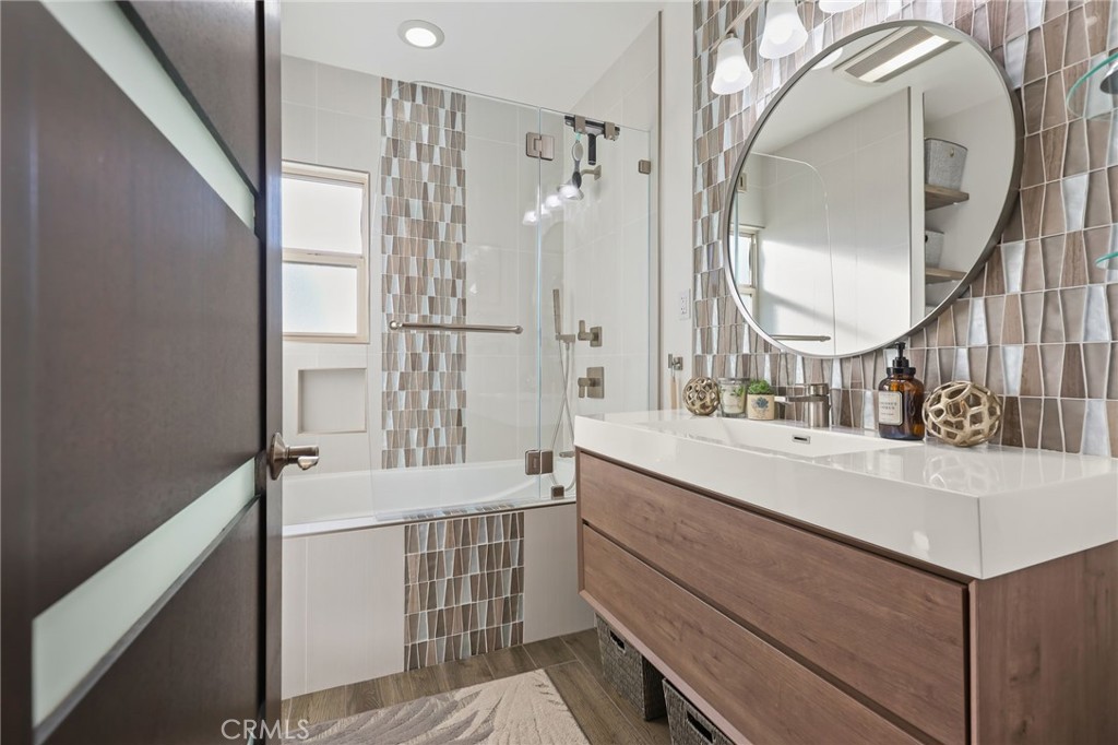 Every bedroom includes custom closet organizers and two bedrooms have new glass closet doors. The renovated bathroom retreat features a six-foot insulated soaking tub/shower combo and a beautifully appointed floating vanity.