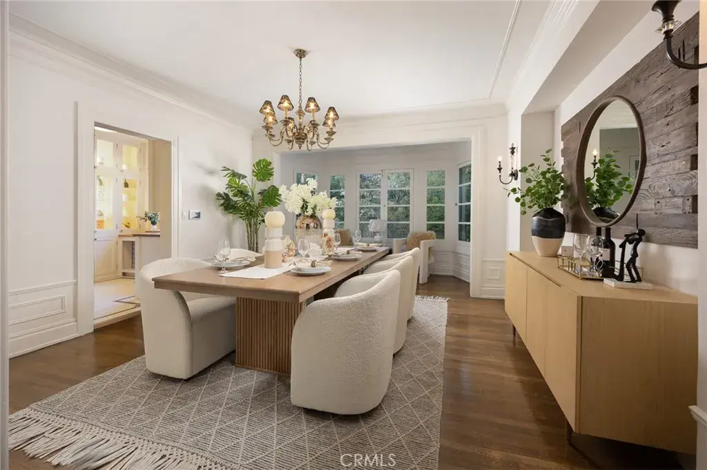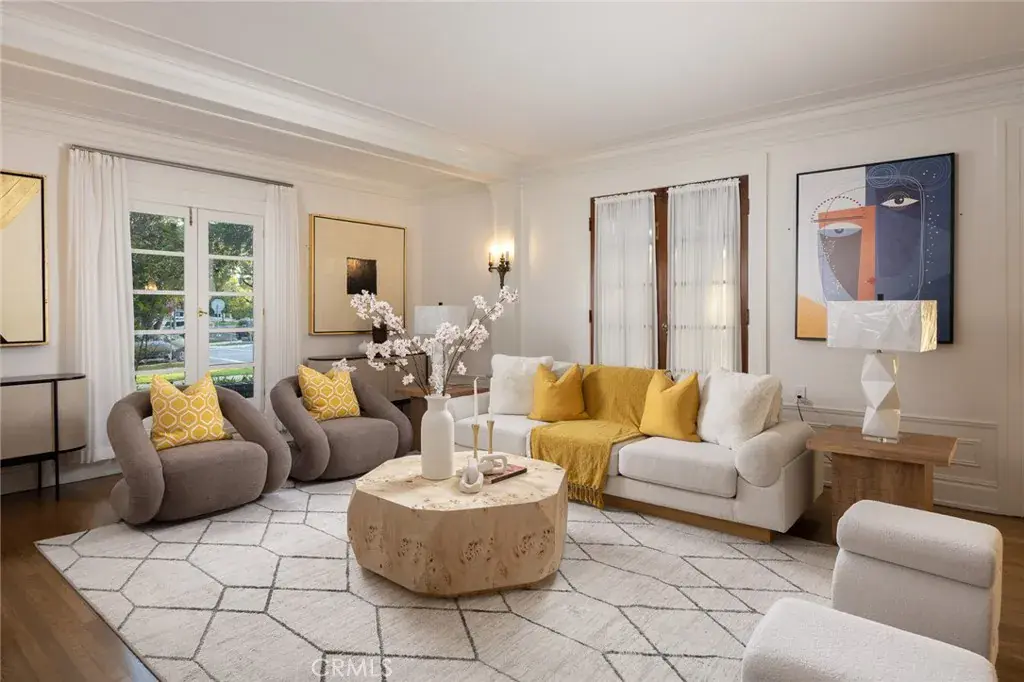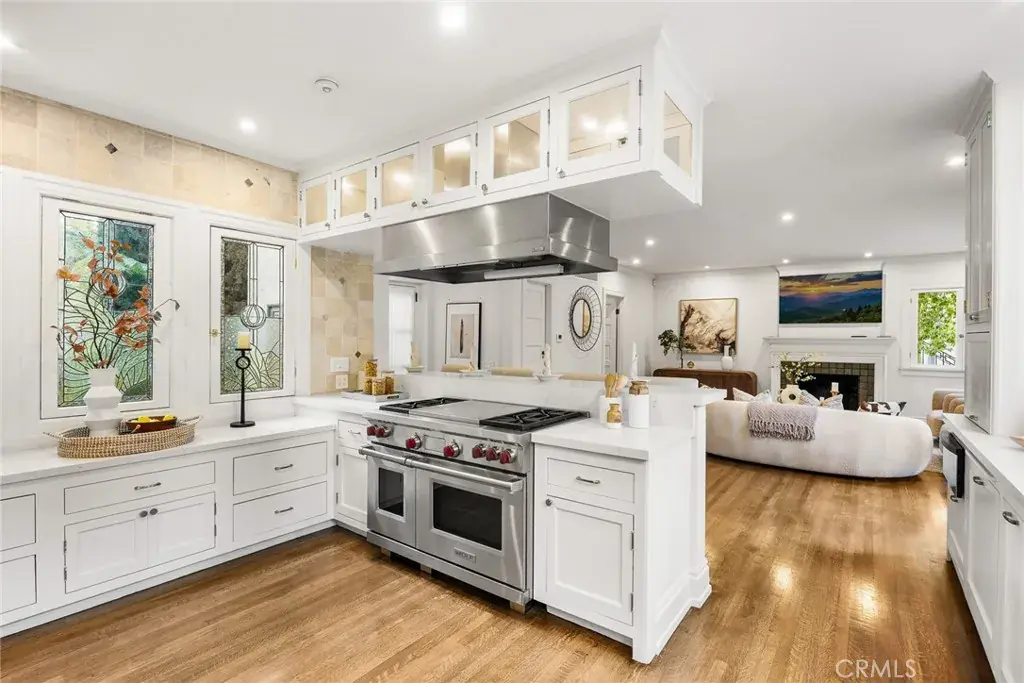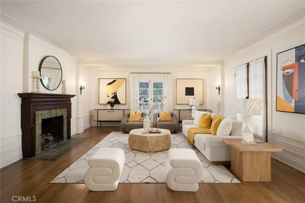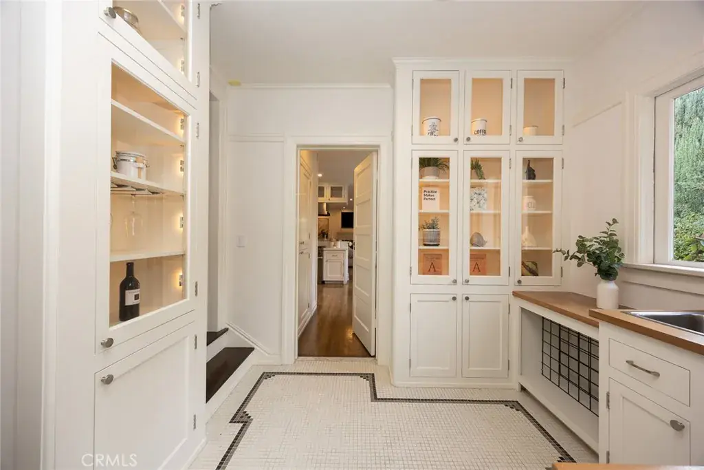 A gracious foyer introduces the home’s Old World soul, where masterful craftsmanship blends seamlessly with modern refinement. The formal living room is bathed in natural light and anchored by a rare Batchelder tile fireplace, with multiple sets of French doors that create a beautiful indoor-outdoor flow. Just beyond, a charming trellis extends the living space outside, perfect for relaxed California living. The richly appointed office features custom wood built-ins and its own Batchelder fireplace, offering a warm and inspiring retreat for work or study.