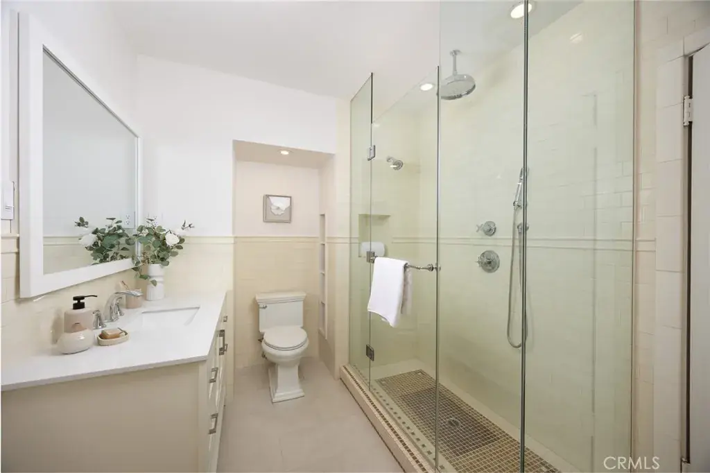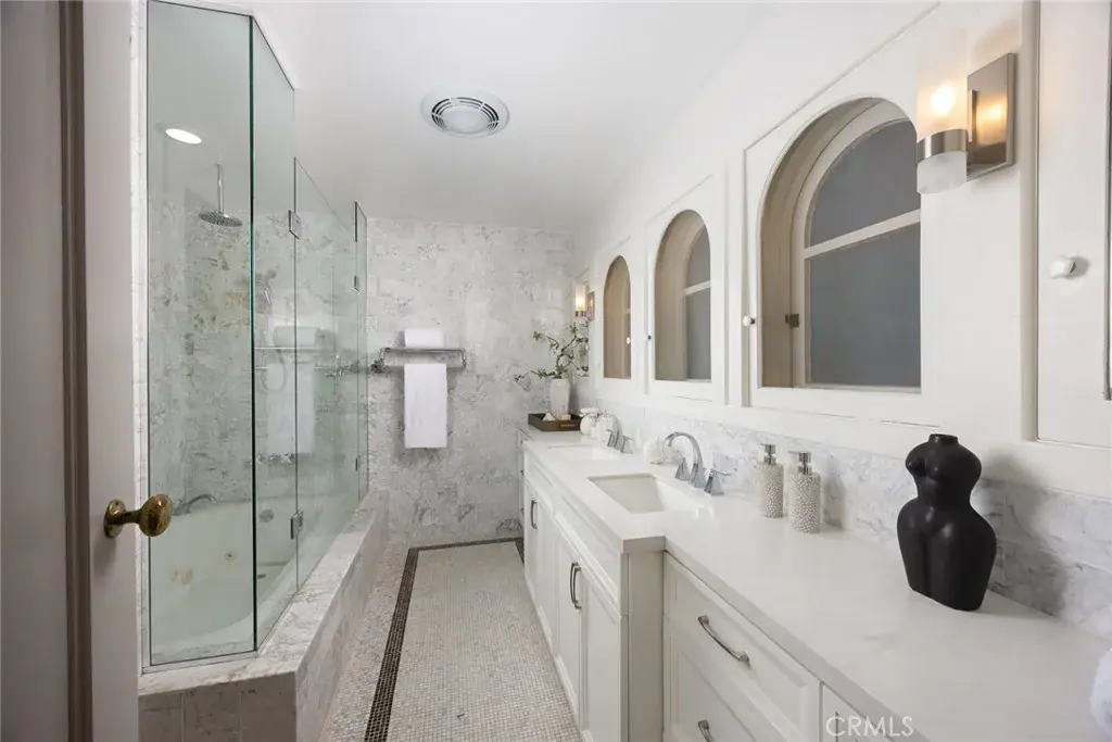 From the family room, French doors lead to a private backyard oasis complete with a sparkling pool and spa, a romantic trellis, and a professional BBQ station—perfect for alfresco dining. A grand staircase leads to four well-appointed bedrooms. The primary suite features custom his-and-her closets and a spa-inspired, updated bathroom. Three additional bedrooms—including a junior suite and a Jack-and-Jill layout with a charming Juliet balcony—provide comfortable accommodations. A whimsical hideaway attic adds a delightful “secret” play space.