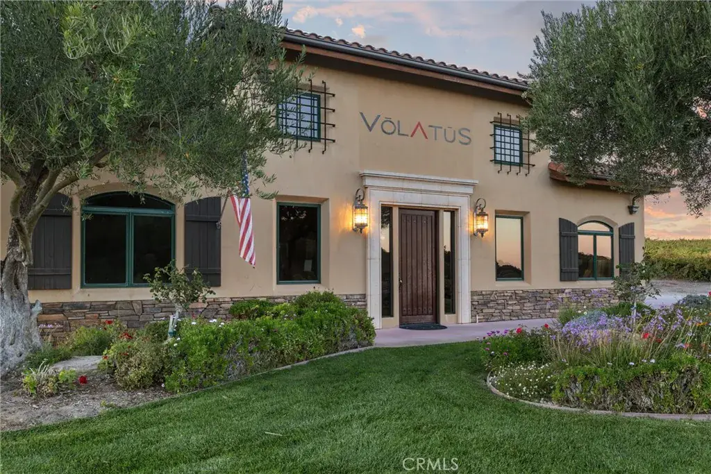 A turnkey 1,500± sq. ft. tasting room, built in 2000, offers an immediate opportunity to establish or expand your brand—or to enjoy a steady revenue stream. The contemporary structure features dramatic high ceilings, a sleek horseshoe-shaped bar, and a foldable pass-through window opening to a vineyard-view patio. Adding to the relaxing atmosphere of the patio, are views of vines, ancient oaks, and garden space, all complimented by spectacular sunset views. One wing houses a temperature-controlled cold storage area, while the opposite wing can serve as a small production area, members’ lounge, or space for showcasing a secondary label. The owner previously operated a boutique tasting room and ran production from the second wing, with barn doors that open to crush pad space. Glass garage-style doors separate the wings from the tasting bar. The tasting room is currently leased, and tenants are open to continuing occupancy.