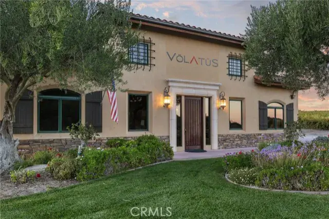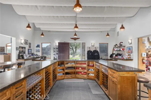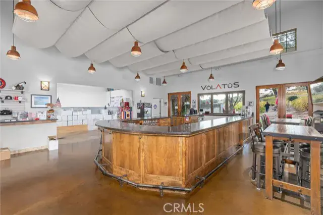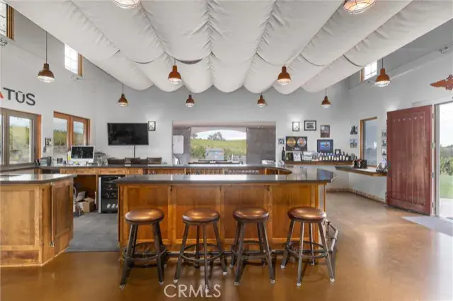 A turnkey 1,500± sq. ft. tasting room, built in 2000, offers an immediate opportunity to establish or expand your brand—or to enjoy a steady revenue stream. The contemporary structure features dramatic high ceilings, a sleek horseshoe-shaped bar, and a foldable pass-through window opening to a vineyard-view patio. Adding to the relaxing atmosphere of the patio, are views of vines, ancient oaks, and garden space, all complimented by spectacular sunset views. One wing houses a temperature-controlled cold storage area, while the opposite wing can serve as a small production area, members’ lounge, or space for showcasing a secondary label. The owner previously operated a boutique tasting room and ran production from the second wing, with barn doors that open to crush pad space. Glass garage-style doors separate the wings from the tasting bar. The tasting room is currently leased, and tenants are open to continuing occupancy.