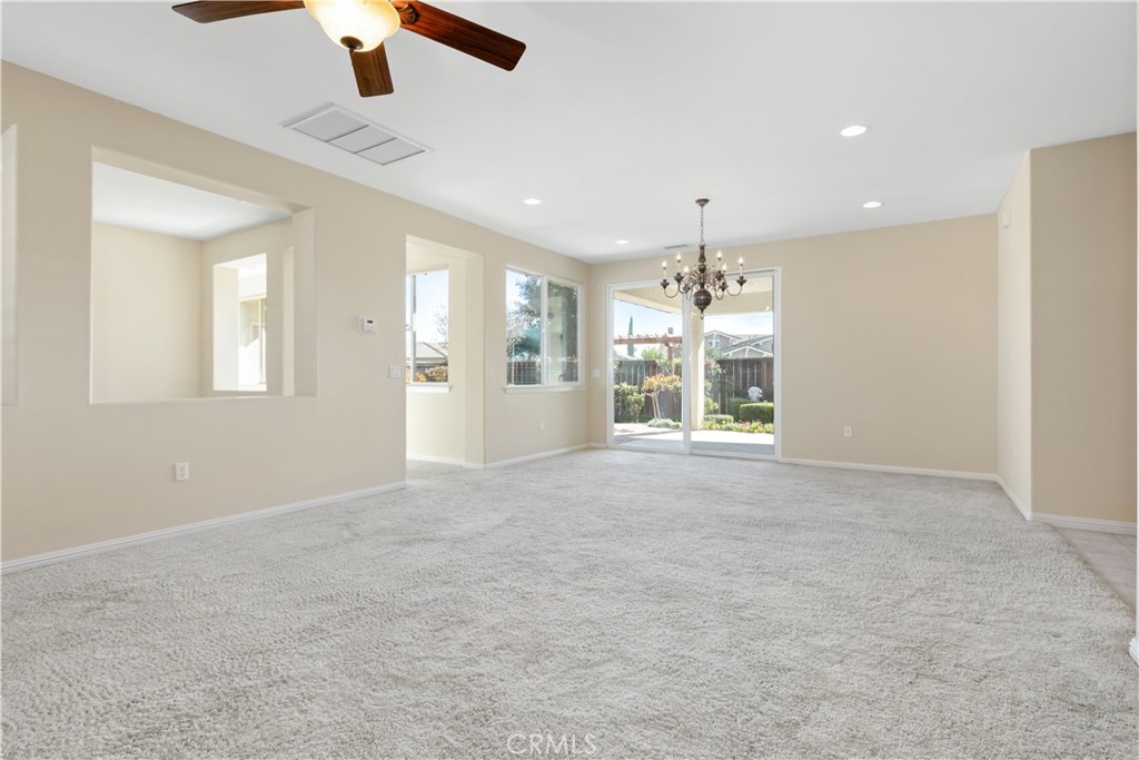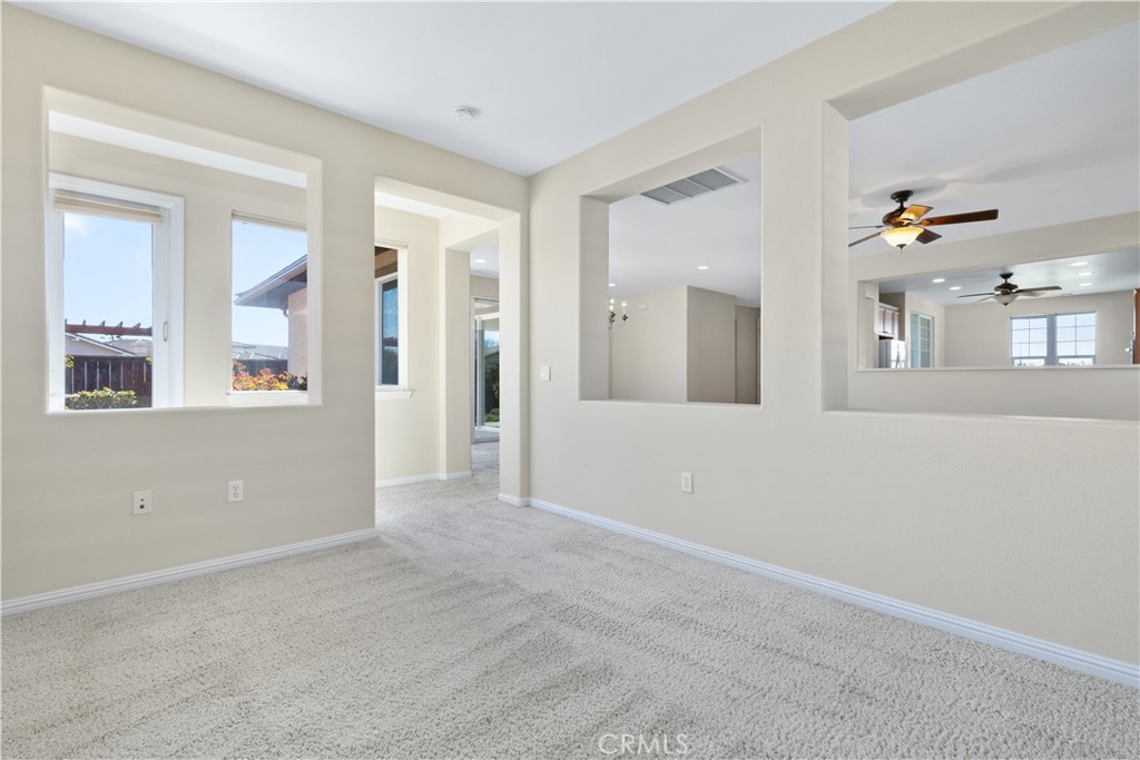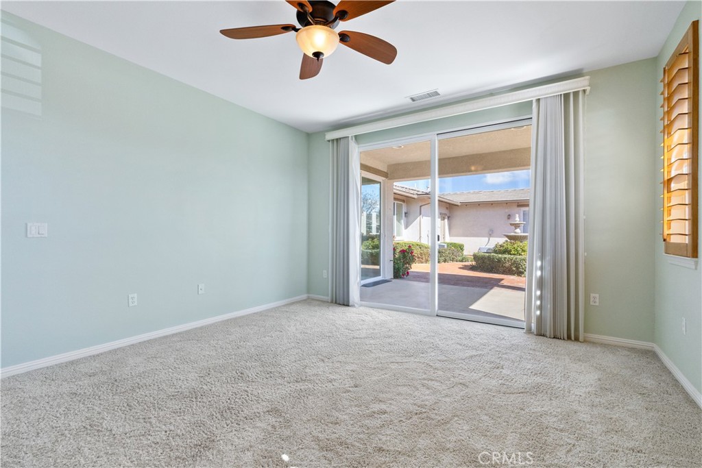 Situated as a desirable end unit, the home enjoys convenient guest parking along Traditions Loop. The front entrance opens directly onto a beautifully manicured greenbelt maintained by the HOA, creating a peaceful and inviting first impression. The finished two-car garage is accessed from Benicia Lane and includes an attached 200+/- square foot hobby room, complete with its own mini-split heating and cooling system, perfect for projects, crafts, or additional workspace.