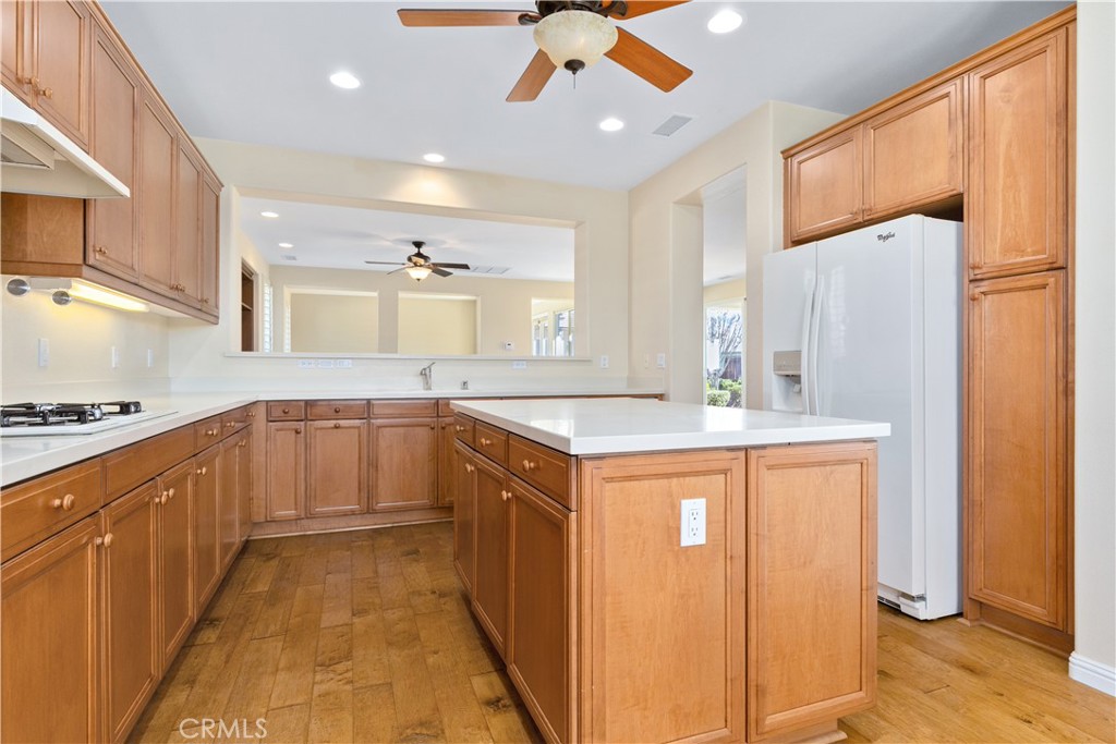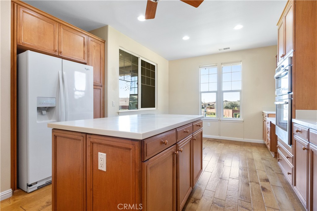 The kitchen features beautiful engineered-wood flooring, solid-surface countertops, under-cabinet lighting, and a newer stainless-steel oven and microwave combination. A charming breakfast nook provides a lovely window view of the greenbelt. The living room offers warmth and ambiance with a gas fireplace that lights instantly with the flip of a switch.