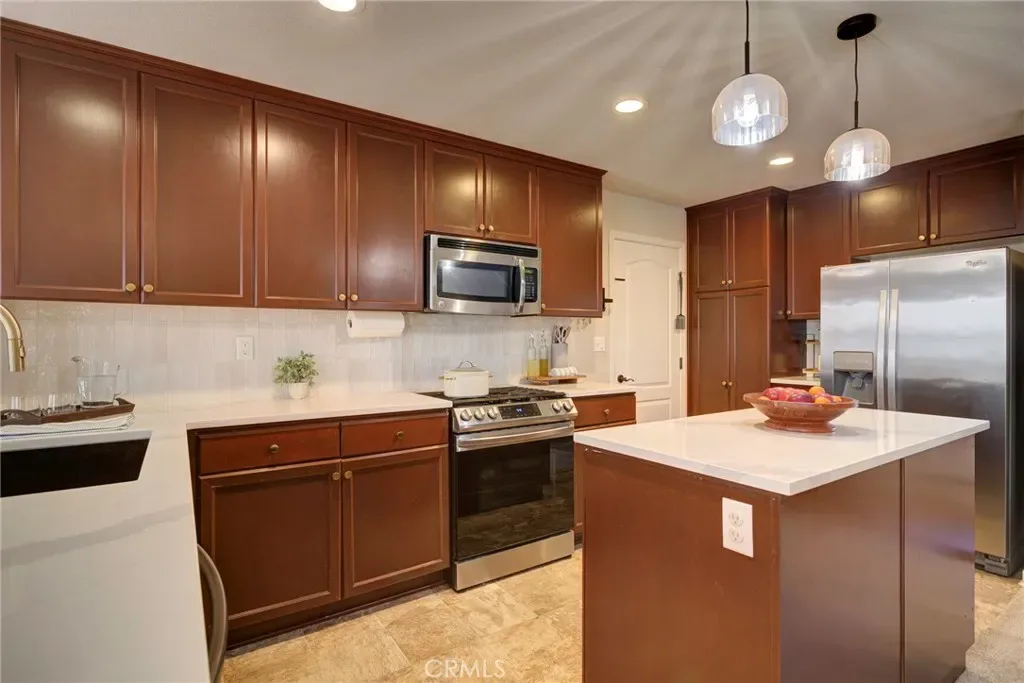 The main level flows effortlessly — living area to kitchen to dining — with sliding glass doors that open to a private courtyard patio perfect for morning coffee, evening wine, or weekend entertaining. The kitchen anchors it all with a center island, white quartz countertops, a brand new sink, and stainless steel appliances — clean, functional, and move-in ready.