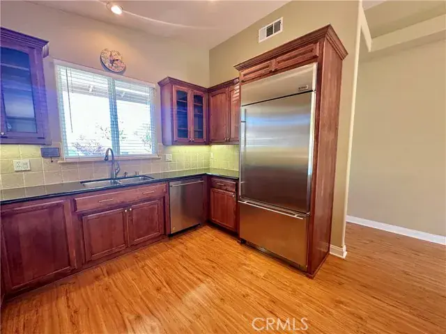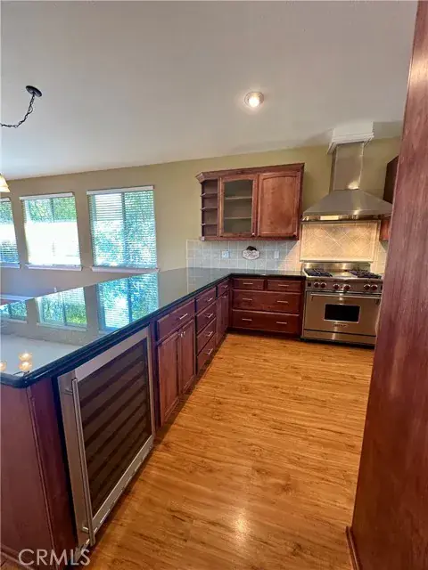 This impressive residence features an open floor plan with expansive windows and glass doors that lead to a large open deck, offering beautiful views of the surrounding hills and green belt. The spacious dining area complements a well-appointed kitchen, complete with a 36″ gas range with four burners and infrared griddle, granite countertops, a built-in refrigerator, a wine fridge, and convenient breakfast bar seating. Comfort is ensured with central air and heating, ceiling fans, and elegantly tiled counters and showers throughout.