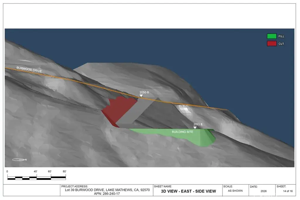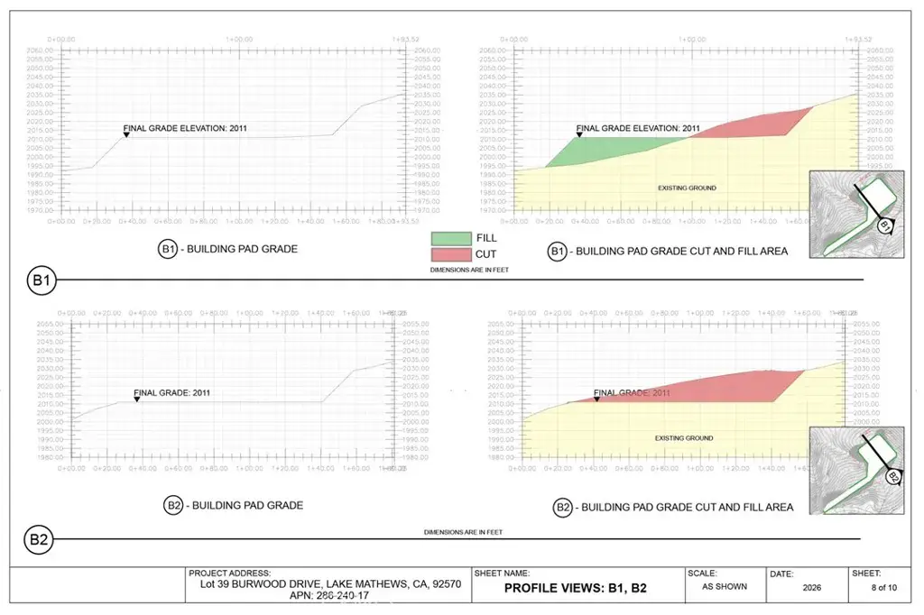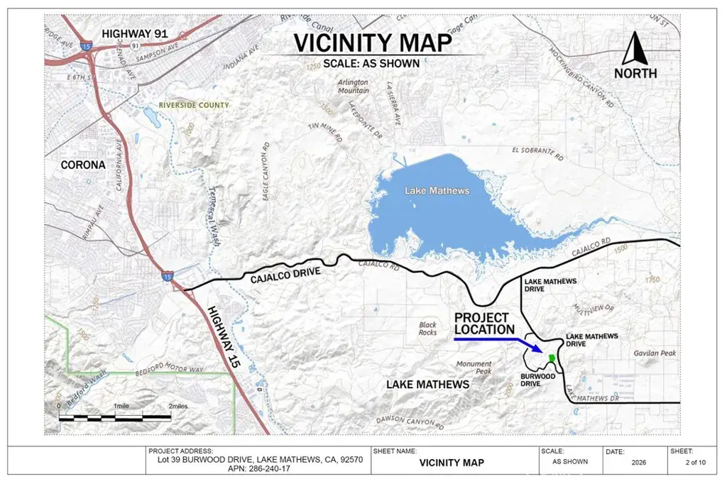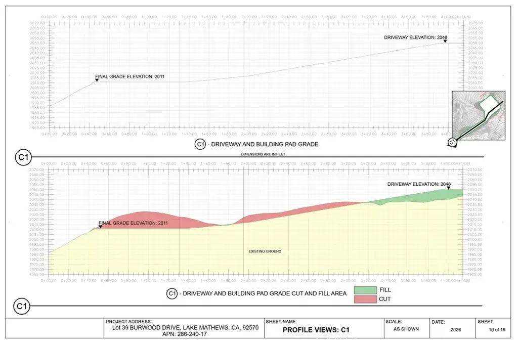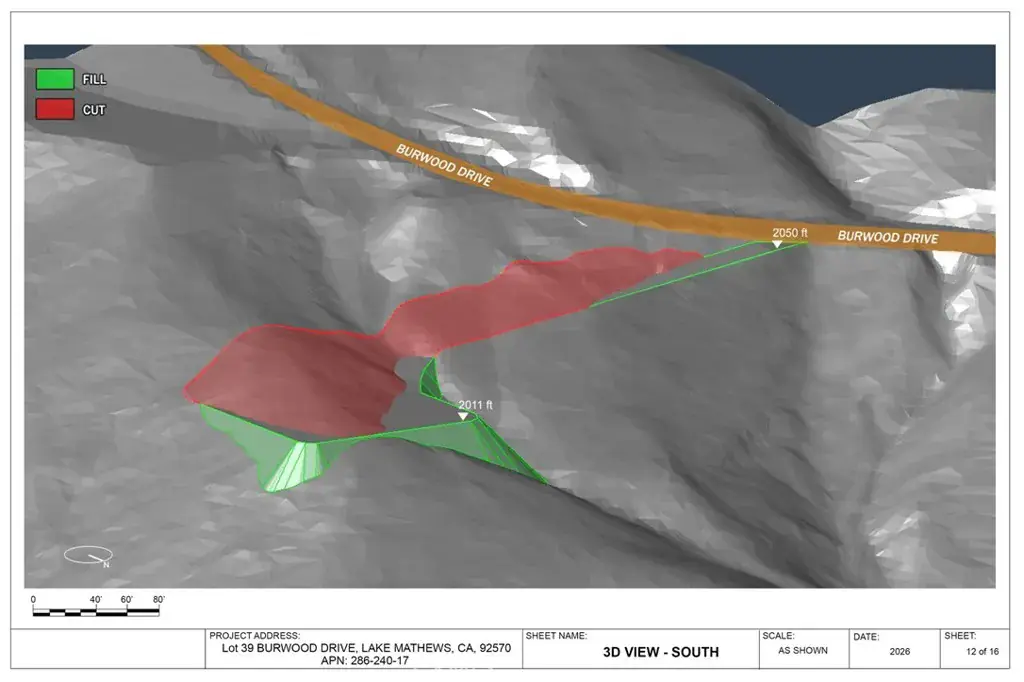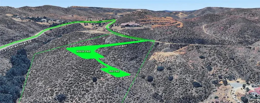 Preliminary engineering grading plans with computer 3D models, calculations and visualizations are included in the purchase. The plans include a 195 feet long driveway, a 115’x110′ graded flat pad for a 4000 square feet house and a 4000 square feet garage to store cars, RVs, boats, motorcycles, or any of your toys. No restriction on build type: from luxury mansion through large custom home to a small home, prefabricated homes to mobile homes, Lake Mathews is developer friendly.