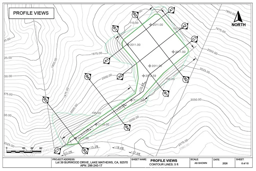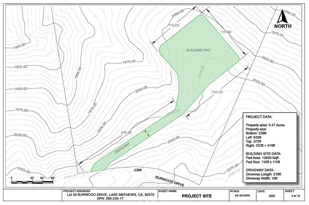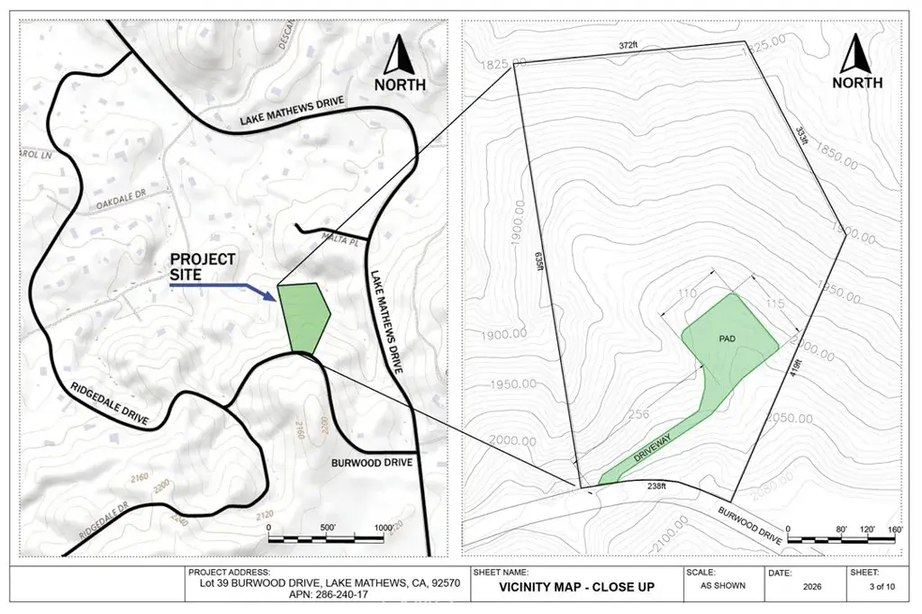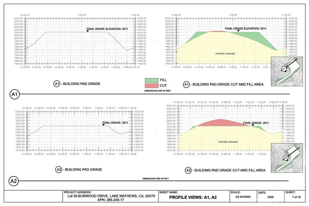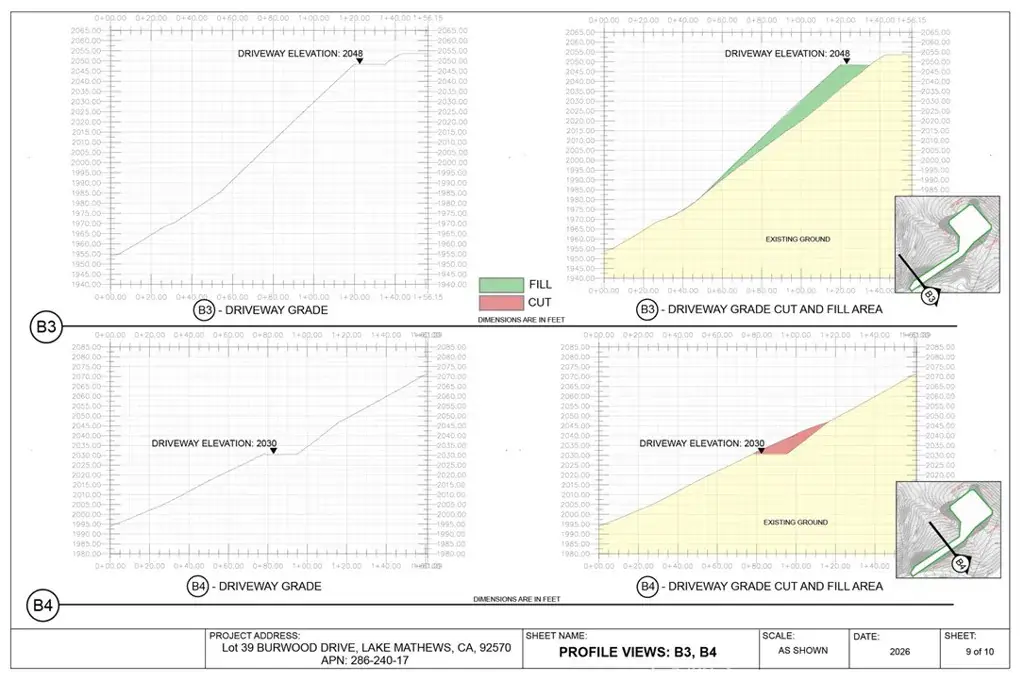 Preliminary engineering grading plans with computer 3D models, calculations and visualizations are included in the purchase. The plans include a 195 feet long driveway, a 115’x110′ graded flat pad for a 4000 square feet house and a 4000 square feet garage to store cars, RVs, boats, motorcycles, or any of your toys. No restriction on build type: from luxury mansion through large custom home to a small home, prefabricated homes to mobile homes, Lake Mathews is developer friendly.