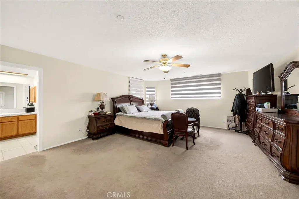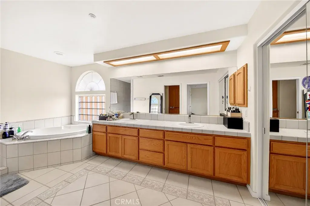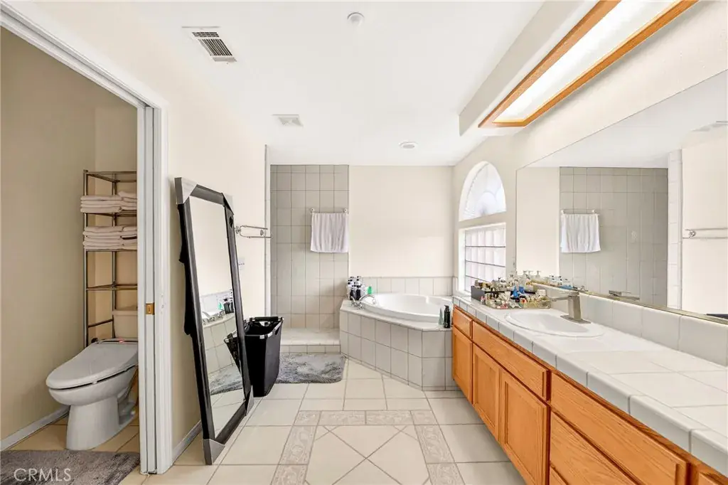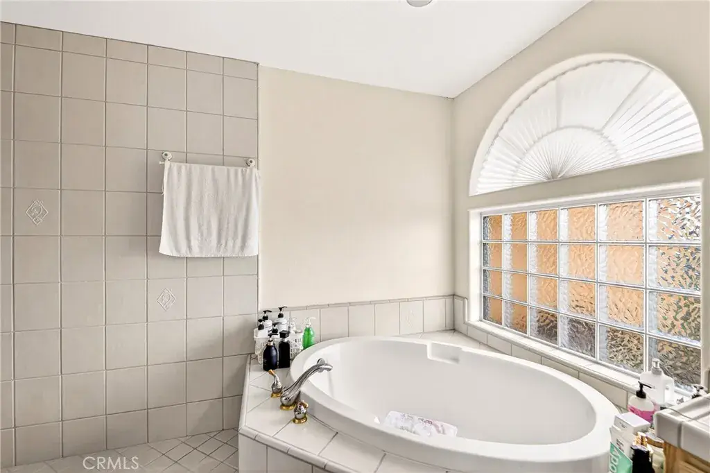 The spacious primary suite features a large walk-in closet and a luxurious ensuite bath complete with a walk-in shower and separate soaking tub. The bathroom also includes dual sinks, tile flooring, and tiled countertops.