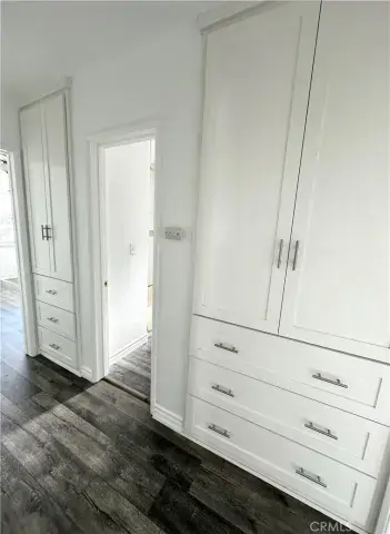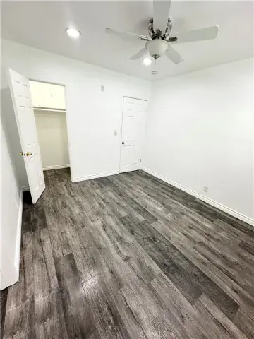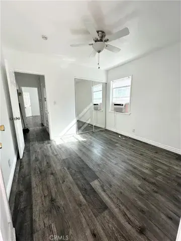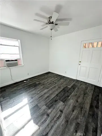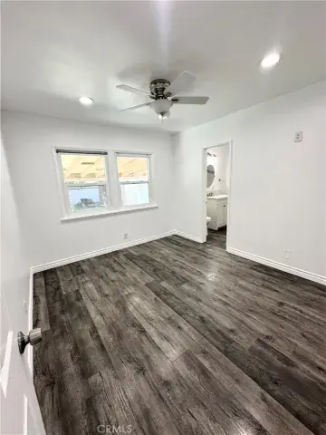 The home features modern white cabinetry throughout, laminate wood flooring, and a clean, contemporary aesthetic. The kitchen is equipped with stainless steel appliances, including the refrigerator and stove. The primary bedroom offers privacy and comfort with its own private bathroom. One of the additional bedrooms provides direct access to the backyard ideal for guests, a home office, or flexible living arrangements. A dedicated laundry room adds everyday convenience.