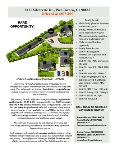 This is a prime development opportunity with plans in progress located in Pico Rivera. The project includes completed architectural layouts and active permit applications with the city. Structural engineering is underway, providing a valuable head start for the next owner. Ideal for investors or builders looking to customize and complete a nearly shovel-ready project.