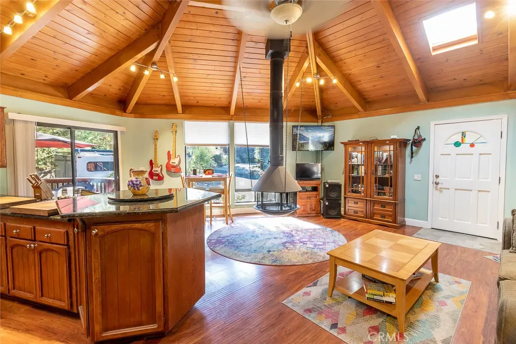 The great room is on the second floor to give you the feel of a tree house with bedrooms on the first floor. Free standing wood fireplace adds to the cabin’s charm with the feel of a campfire.