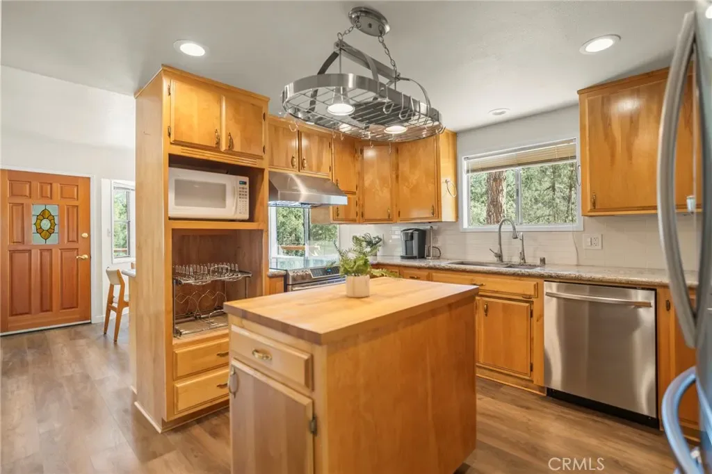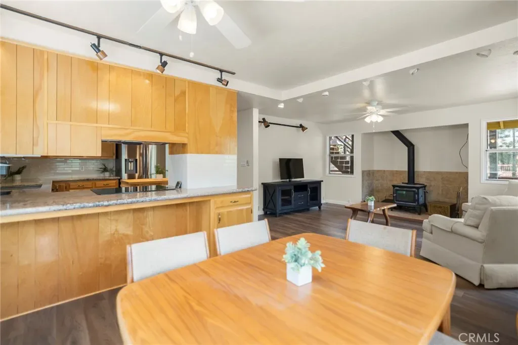 Step inside to an inviting interior filled with natural light and enhanced by thoughtful upgrades throughout. The renovated kitchen shines with a modern backsplash, updated countertops, and sleek satin and stainless steel appliances, seamlessly opening to the dining and living areas—perfect for entertaining. Newly remodeled bathrooms feature updated vanities, countertops, and stylish finishes, creating a fresh, contemporary feel. A cozy wood-burning fireplace anchors the living space, adding warmth and character to this mountain retreat.