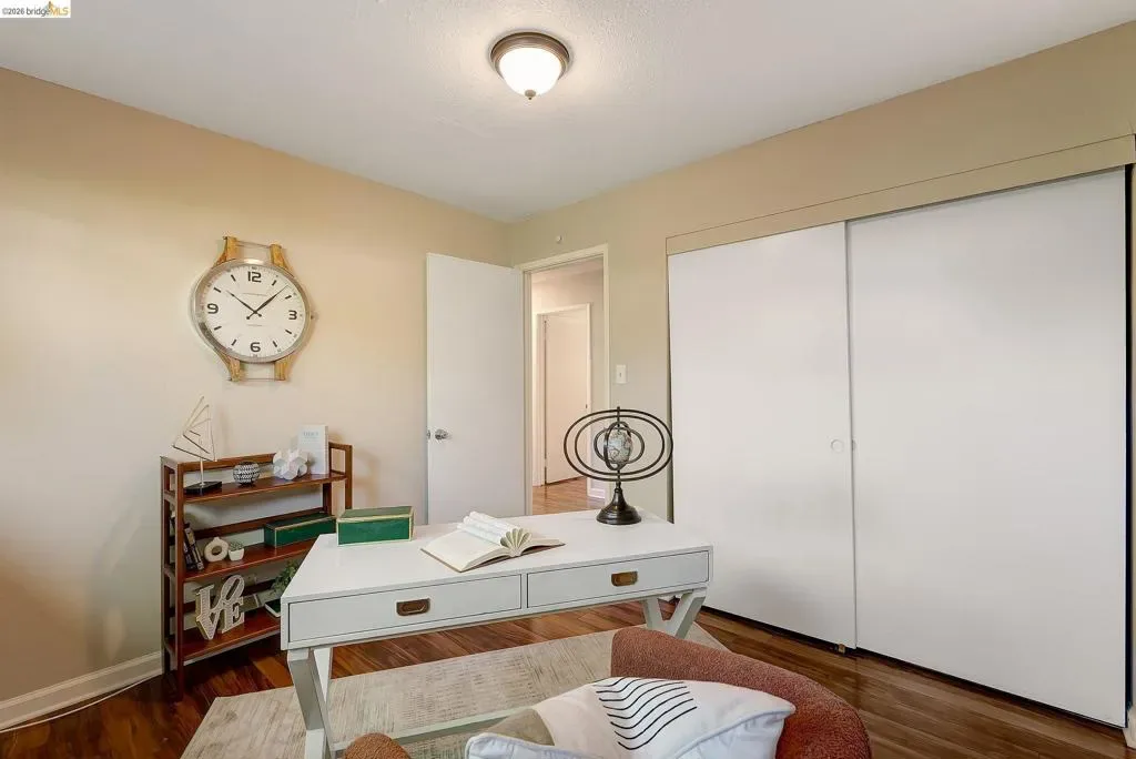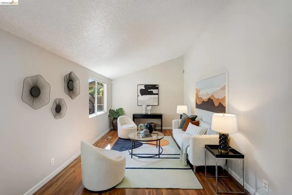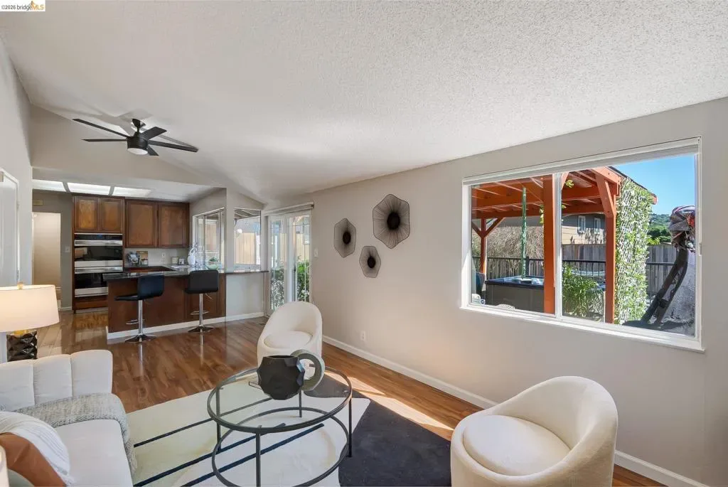 Beautiful Ranch Style Home with covered Deck & Hot Tub. Set in a quiet residential pocket of Pinole Valley, close to schools, shops, and parks, this well-maintained single-level 4BR/2BA home offers 1,795 sq ft of living space*. A modern front yard sets the tone—agave and native grasses, dramatic and no-fuss. Vaulted ceilings and an easy, open flow create a relaxed vibe. The living room, with a brick fireplace for cool evenings, and a formal dining area connect naturally to the kitchen, where quartz counters, a double oven, and bar seating create a hub for chatty guests. Rear Sliding doors open to a covered deck—shaded, with generous seating and a built-in hot tub. The layout separates living and sleeping spaces. The primary bedroom features an ensuite bath with a walk-in tub. Two additional bedrooms share a double-sink bath with direct deck access, while a fourth room works as an office or studio. Laundry is in the oversized two-car garage with storage and workspace. Out back, the yard is open and flexible—gravel underfoot, with room for raised veggie beds and lawn chairs. Fenced for pets. Plentiful driveway parking. Invite friends for walk on the Bay Trail or a bike ride around the reservoir, then come home to soak. The livin’ is easy! *Per public record.