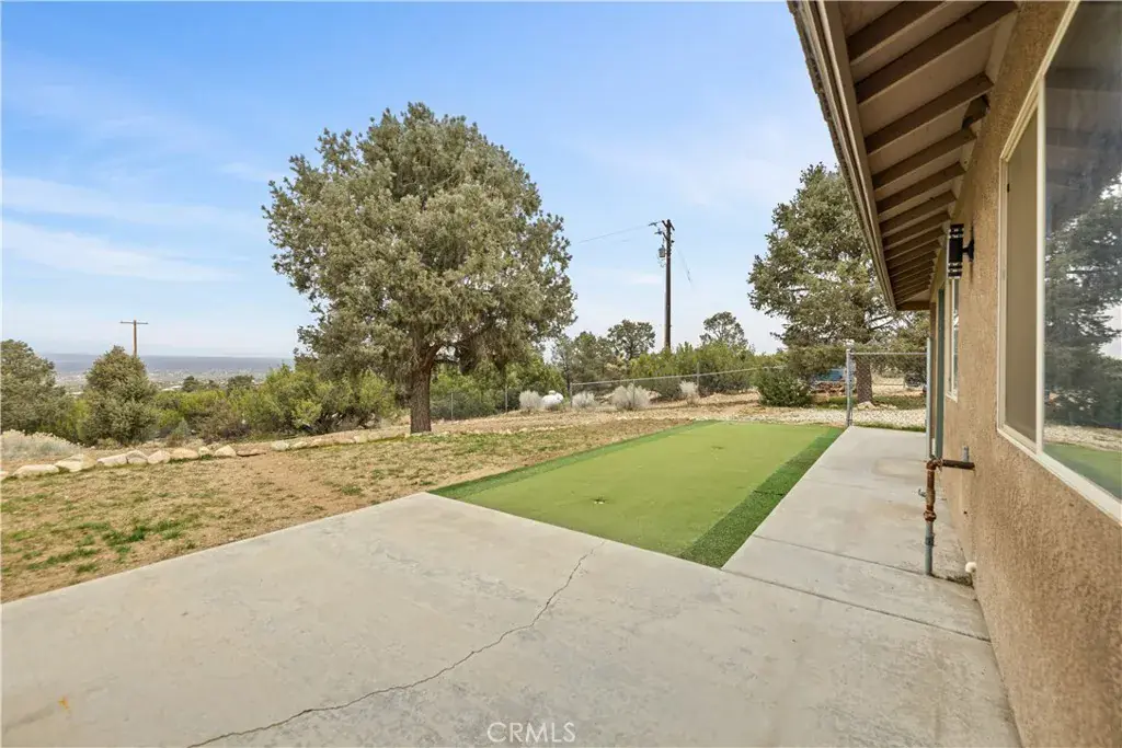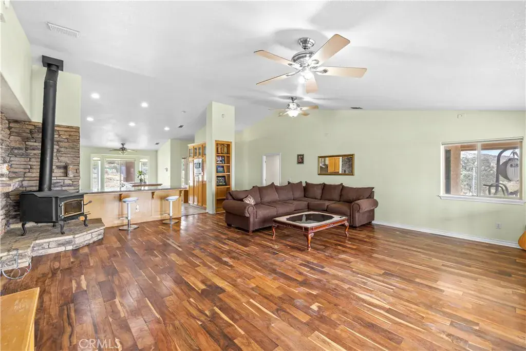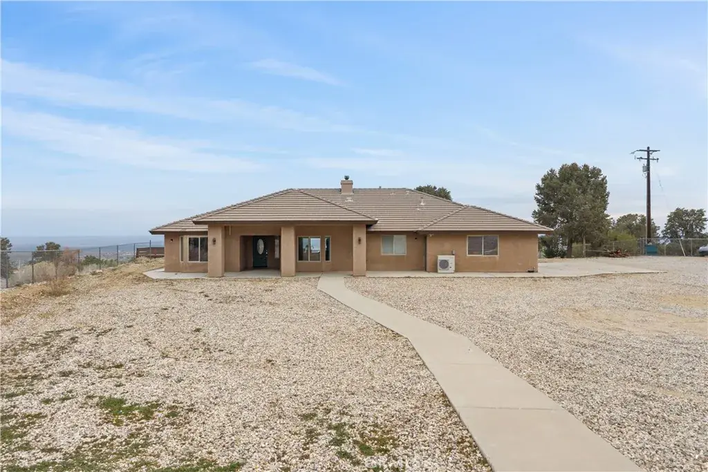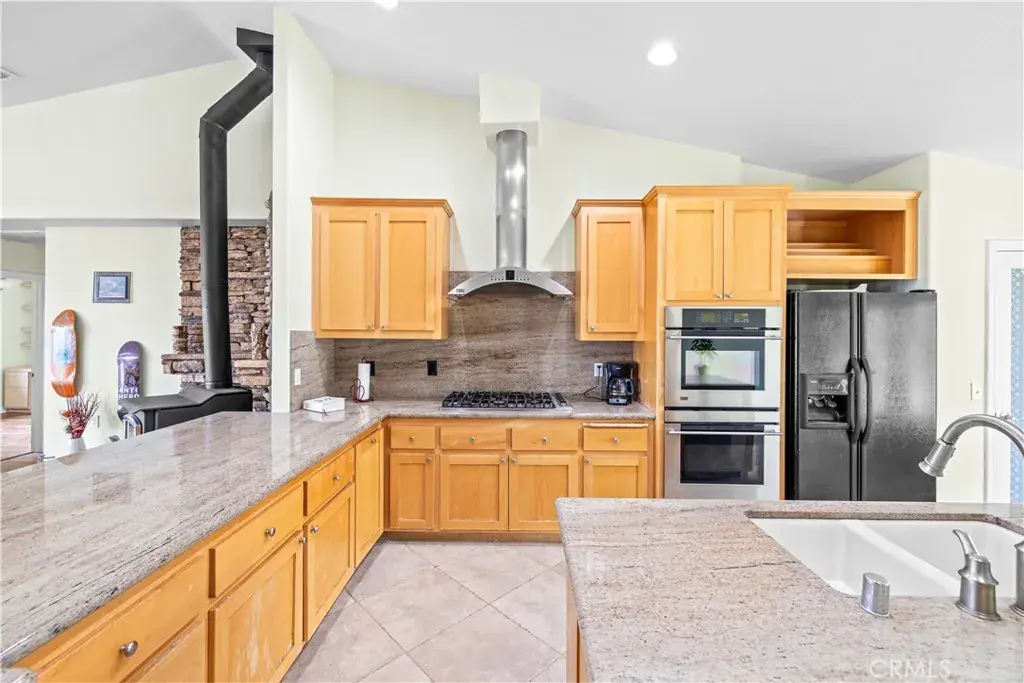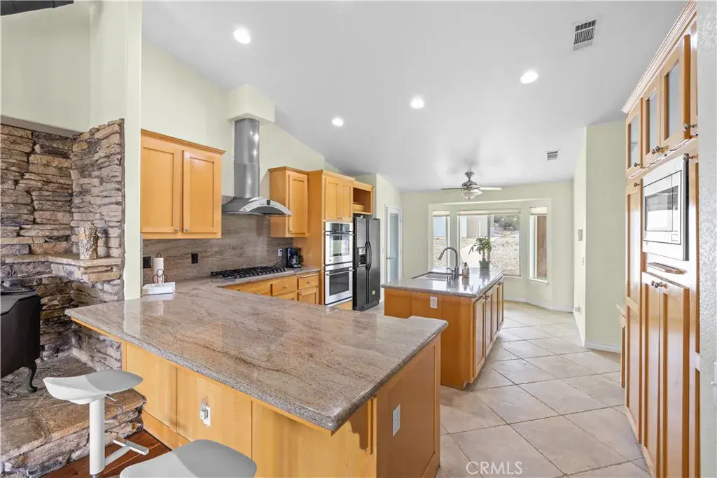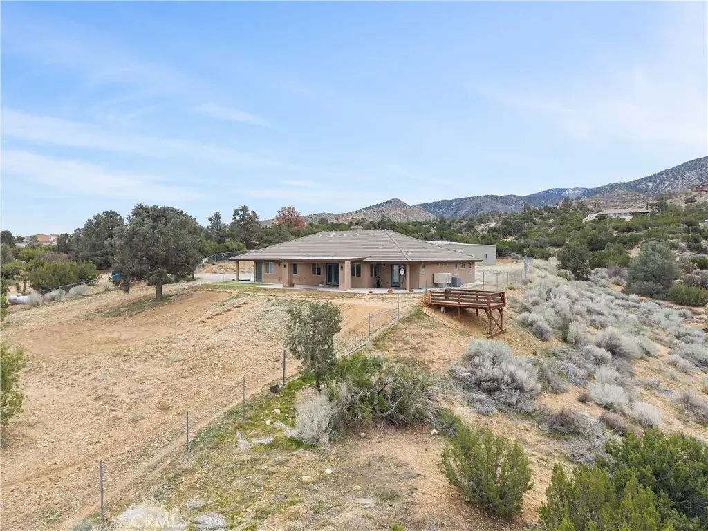 Nestled on a sprawling 4.32-acre lot in tranquil Pinon Hills, this charming 4-bedroom, 2-bathroom home offers 2,297 square feet of modern living space. Inside, enjoy vaulted ceilings, Acacia wood flooring, and a cozy wood-burning stove in the living room. The gourmet kitchen features granite countertops, double ovens, cooktop stove, and an island, with a refrigerator included. The master suite boasts a walk-in closet, on-suite bathroom, and outdoor access. Outdoors, the property features an attached 3-car garage, a fully insulated 40×25 ft warehouse, and a 14×25 ft RV garage, perfect for workshops or storage. Upgraded with a 400-amp electrical system, this home is ideal for RV enthusiasts or hobbyists. The expansive lot offers privacy, panoramic high desert views, and potential for subdivision. Experience serene desert living with modern comforts and endless possibilities!