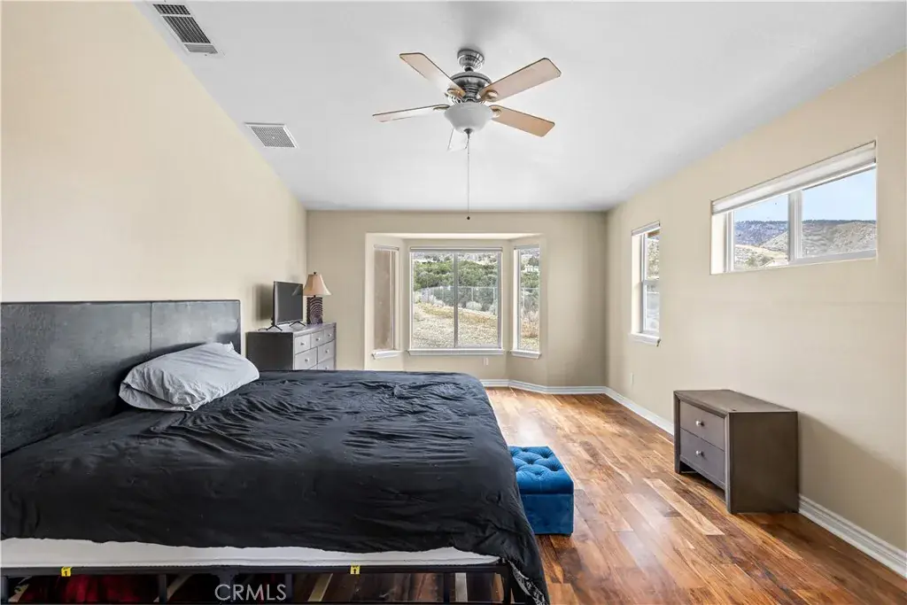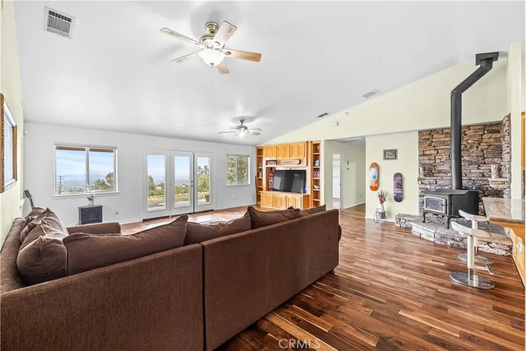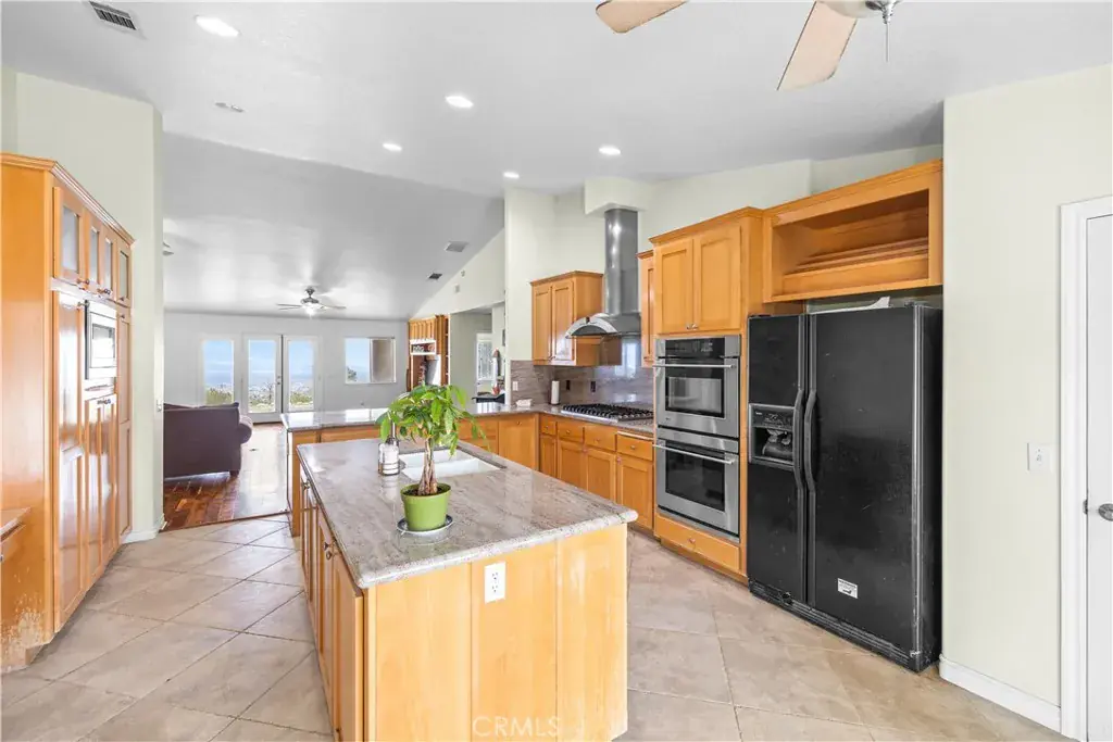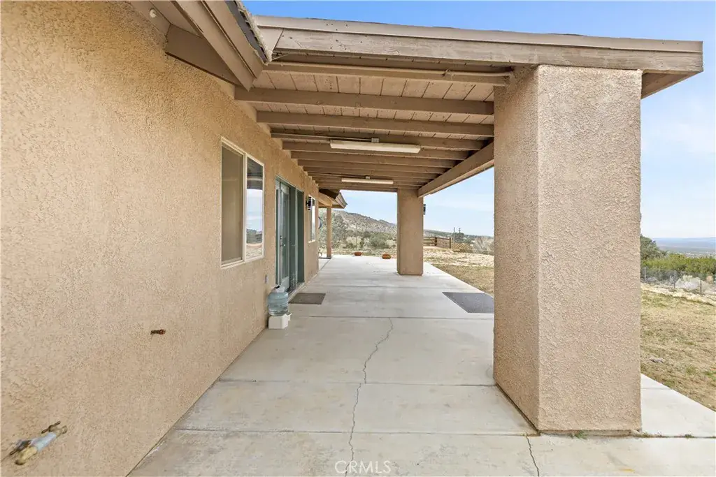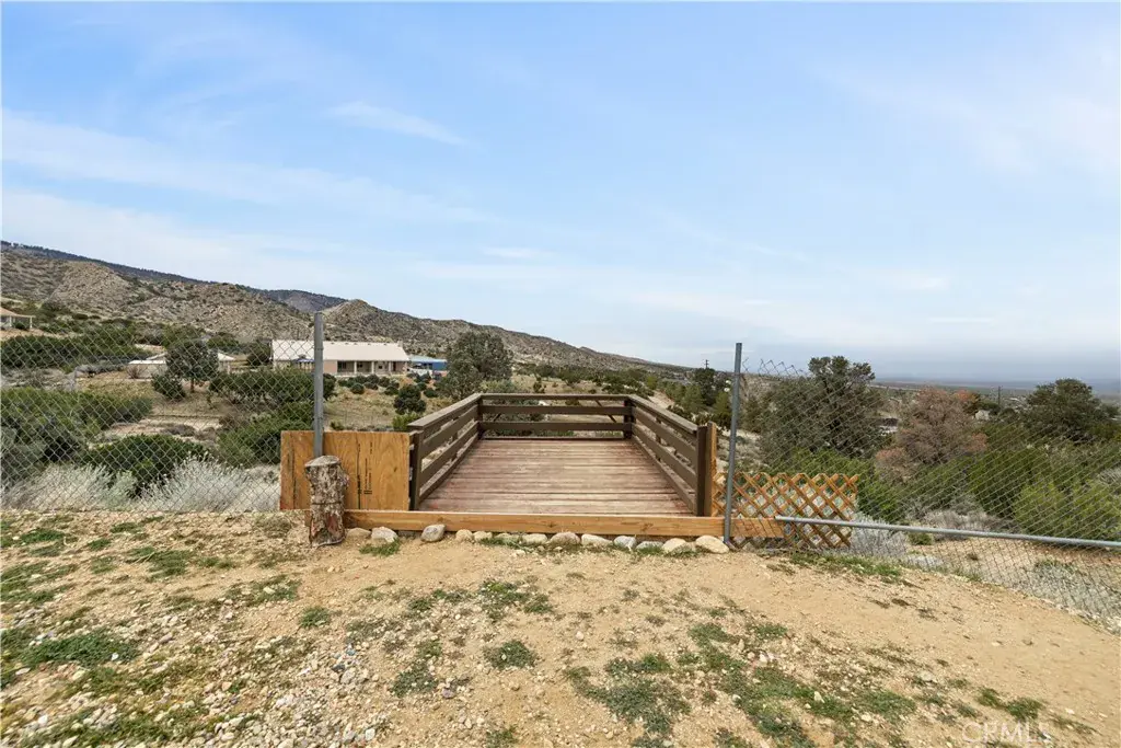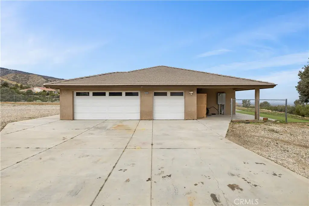 Nestled on a sprawling 4.32-acre lot in tranquil Pinon Hills, this charming 4-bedroom, 2-bathroom home offers 2,297 square feet of modern living space. Inside, enjoy vaulted ceilings, Acacia wood flooring, and a cozy wood-burning stove in the living room. The gourmet kitchen features granite countertops, double ovens, cooktop stove, and an island, with a refrigerator included. The master suite boasts a walk-in closet, on-suite bathroom, and outdoor access. Outdoors, the property features an attached 3-car garage, a fully insulated 40×25 ft warehouse, and a 14×25 ft RV garage, perfect for workshops or storage. Upgraded with a 400-amp electrical system, this home is ideal for RV enthusiasts or hobbyists. The expansive lot offers privacy, panoramic high desert views, and potential for subdivision. Experience serene desert living with modern comforts and endless possibilities!