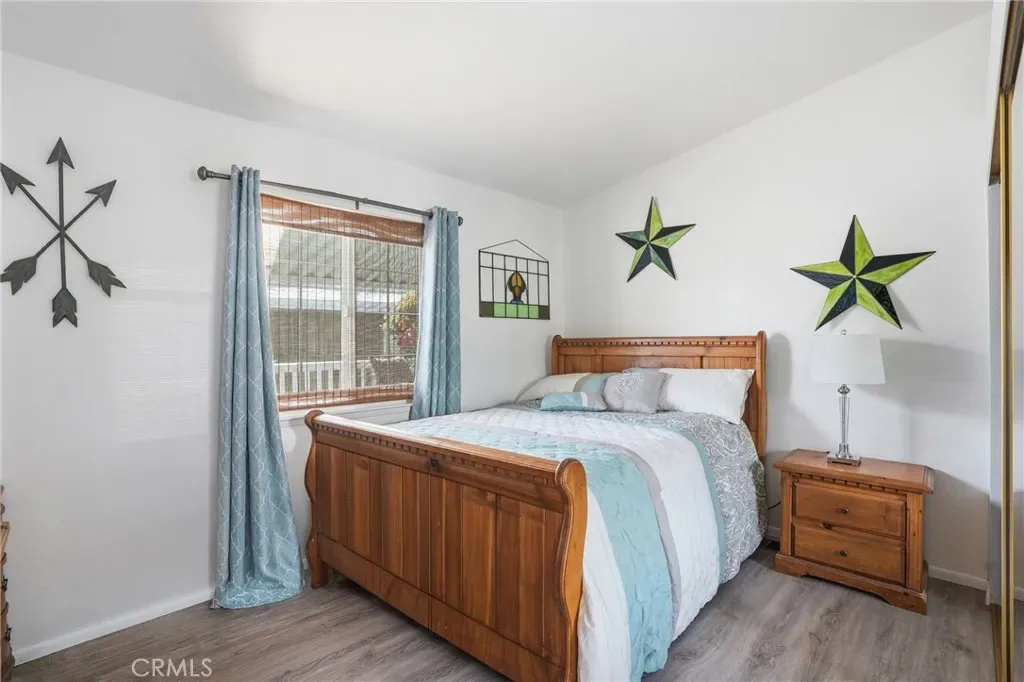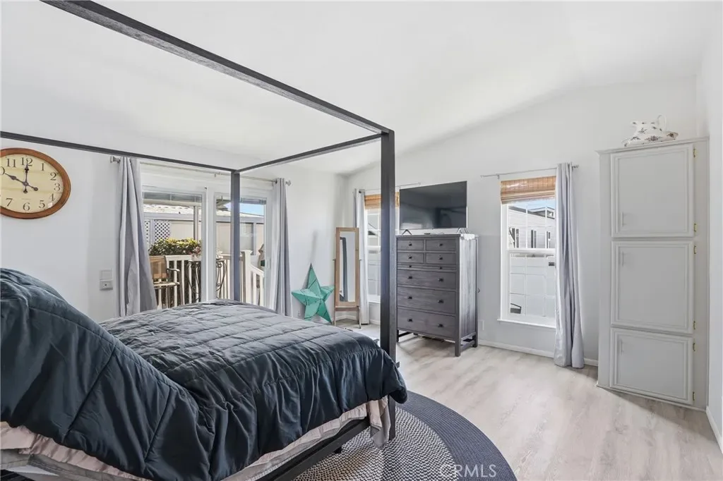 The primary suite serves as a private retreat, complete with its own sliding glass door to the deck, a walk-in closet, built-in storage, and an en-suite bathroom featuring a single vanity, shower, and generous cabinetry. A well-appointed second bedroom is conveniently located near the guest bathroom, offering flexibility for visitors, hobbies, or a home office.