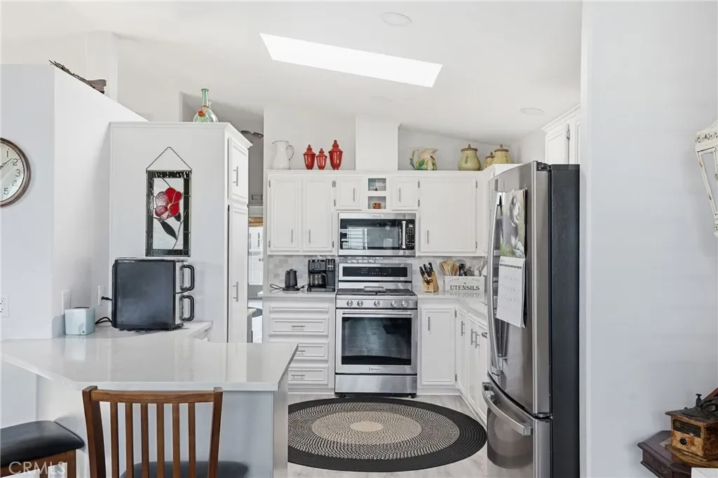 Step inside to an inviting open-concept layout featuring laminate flooring throughout and an abundance of natural light. The spacious living room welcomes you with vaulted ceilings, a cozy fireplace, built-in cabinetry, and a ceiling fan—creating a warm yet airy space to unwind or entertain. The kitchen is thoughtfully designed with a breakfast bar, stainless steel appliances, ample storage, a bay window, and a skylight that fills the space with sunshine. Just off the kitchen, the dining area offers additional built-in cabinetry and a sliding glass door that opens seamlessly to the deck, perfect for indoor-outdoor living.