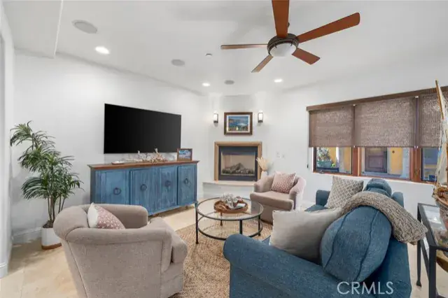 The main level also includes a spacious guest bedroom and a full bathroom—ideal for visitors or multi-generational living. Upstairs, retreat to your luxurious primary suite complete with a second fireplace, spa-like ensuite bath, and walk-in closet. A third bedroom, additional full bathroom, laundry closet, and a flex space—perfect for office or sitting area—round out the upper level, along with patio access for enjoying the ocean breeze.
