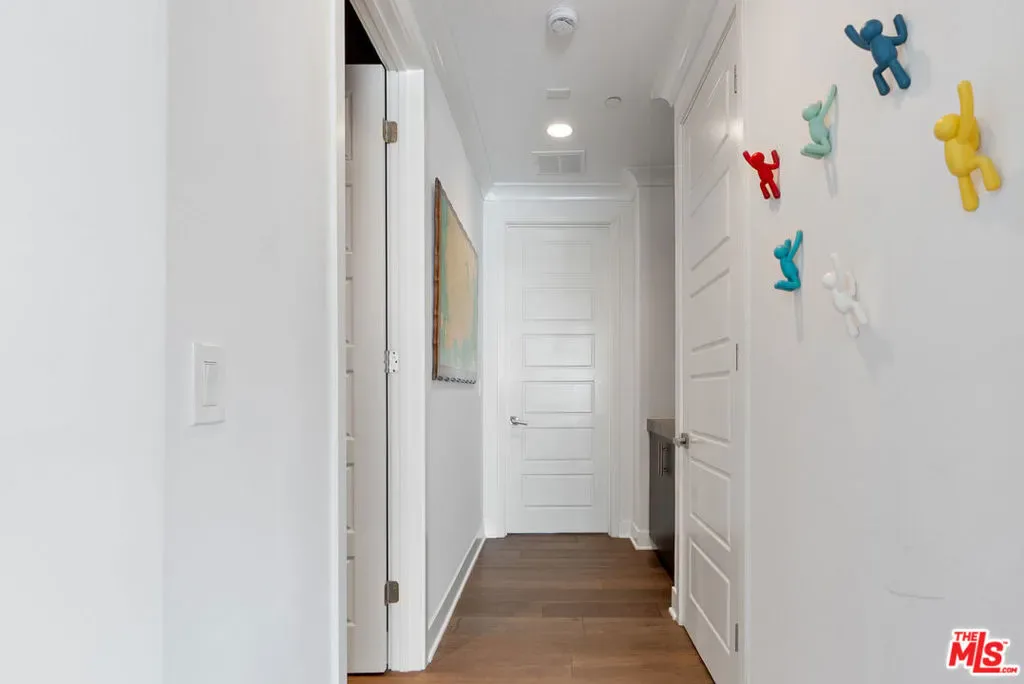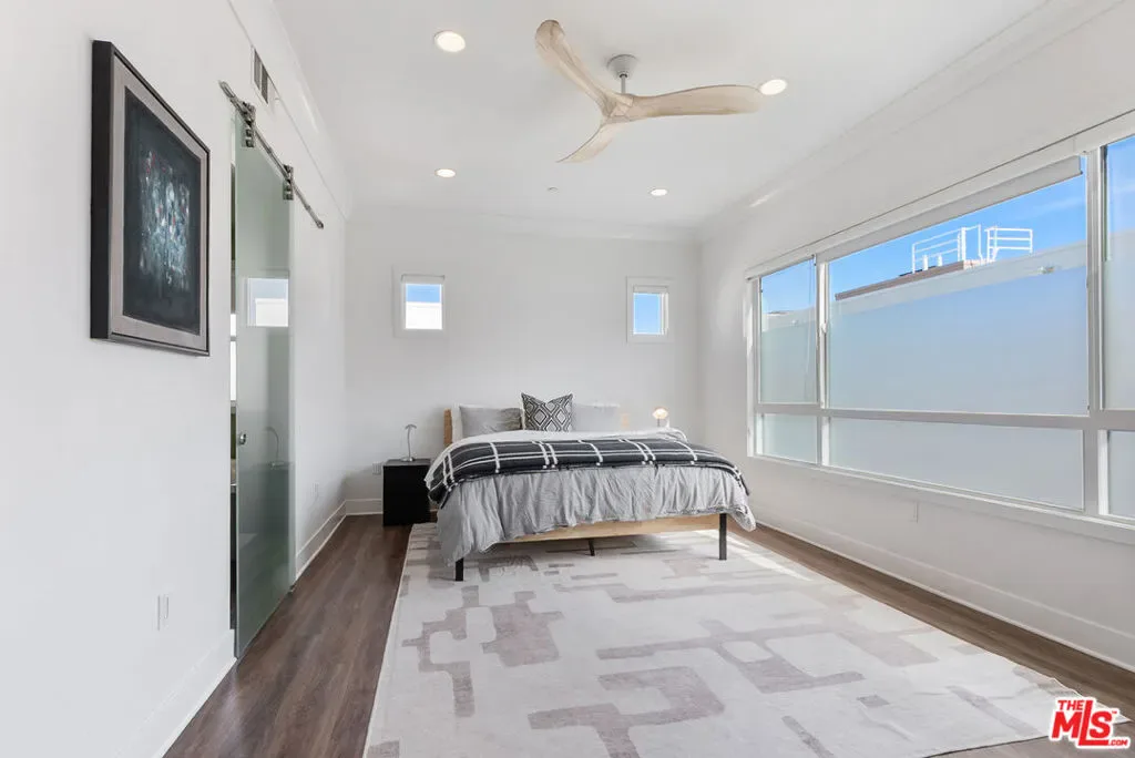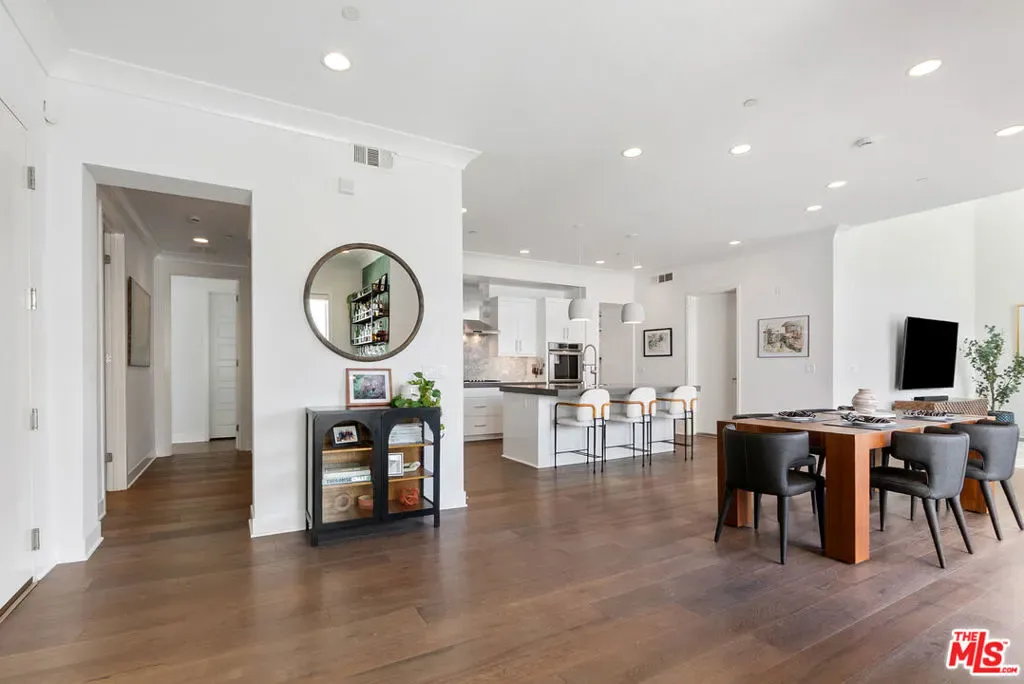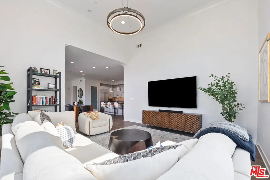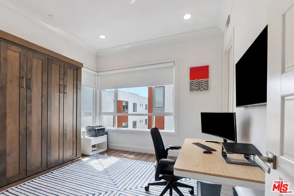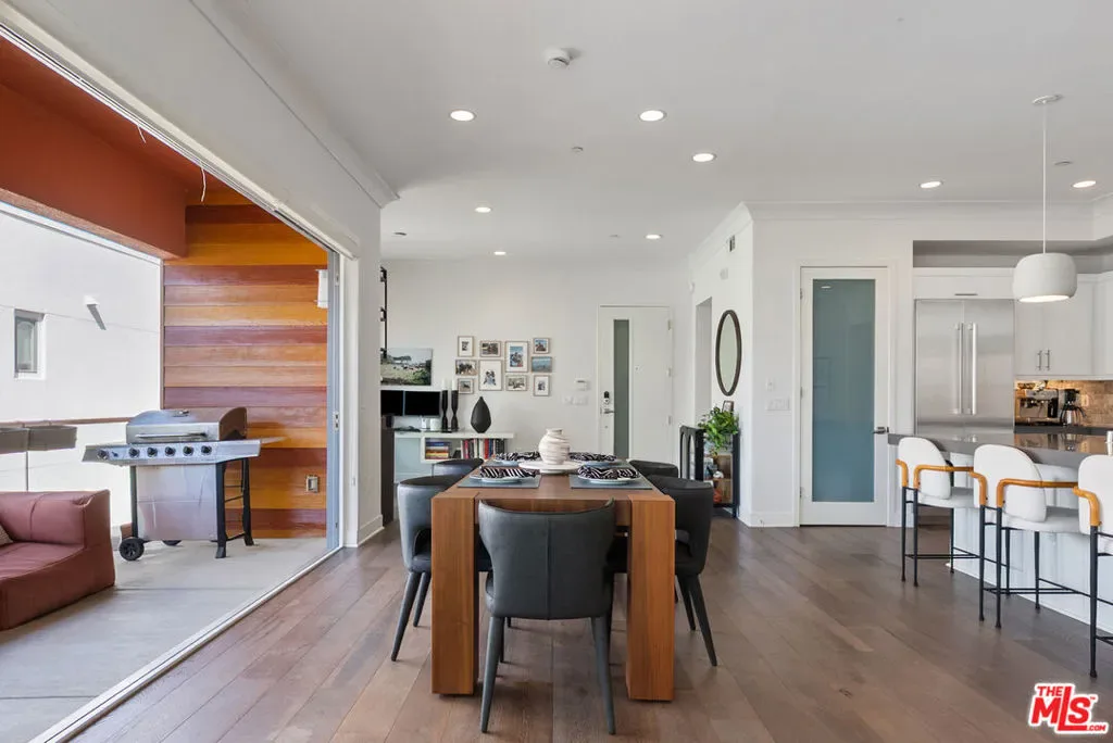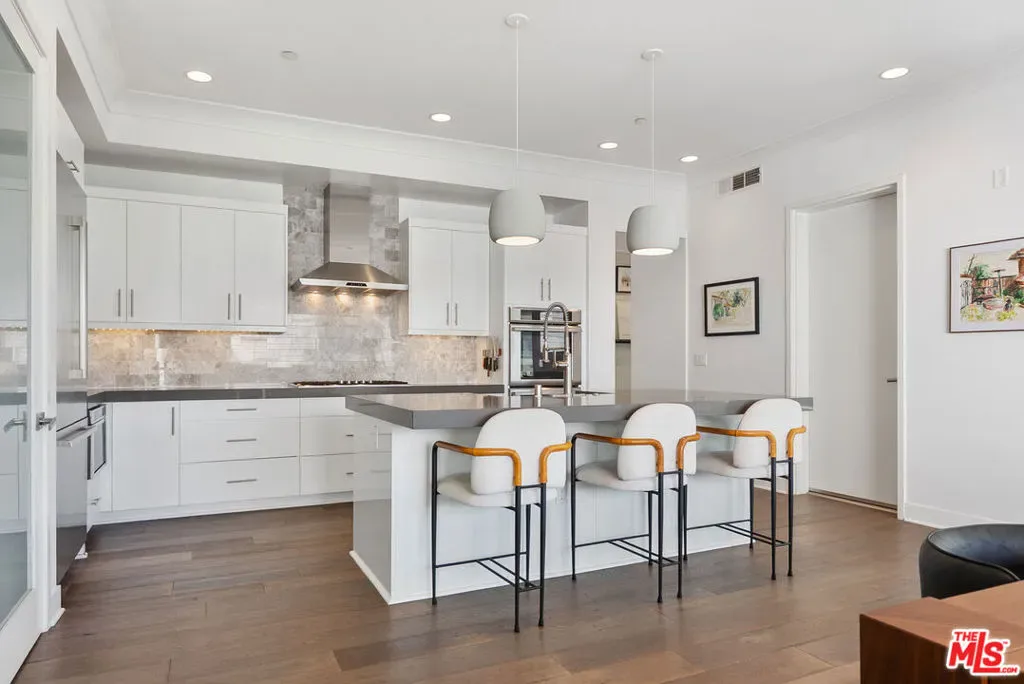 Stunning single-level Skylar penthouse featuring soaring ceilings and an expansive open floor plan. Step inside to an abundance of natural light, highlighted by gorgeous wide plank hardwood flooring throughout. The chef’s kitchen is beautifully appointed with top-of-the-line stainless steel Thermador appliances, an oversized center island with striking pendant lighting, marble backsplash, and a walk-in pantry. The kitchen flows effortlessly into the dining area, where accordion doors open to an oversized patio, creating a seamless indoor-outdoor living experience. Just beyond the dining space is a spacious living room with dramatic high ceilings and large windows that flood the home with light. Retreat to the luxurious primary suite featuring two walk-in closets and a contemporary bathroom complete with an elegant glass barn door, soaking tub, glass enclosed shower, and dual sink vanity. On the opposite side of the home are two generously proportioned bedrooms, one featuring a custom Murphy bed, connected by a modern Jack and Jill bathroom. Additional amenities include a fully renovated powder room, a custom built-in bar with a wine fridge, a generous laundry room with a new washer and dryer, a private two car garage with built-in storage and an EV charger, solar panels, and exceptional privacy as the only residence on the top floor. Enjoy the best of Playa Vista living at Osprey Ln, just moments from shops, dining, parks, and everything this vibrant community has to offer.