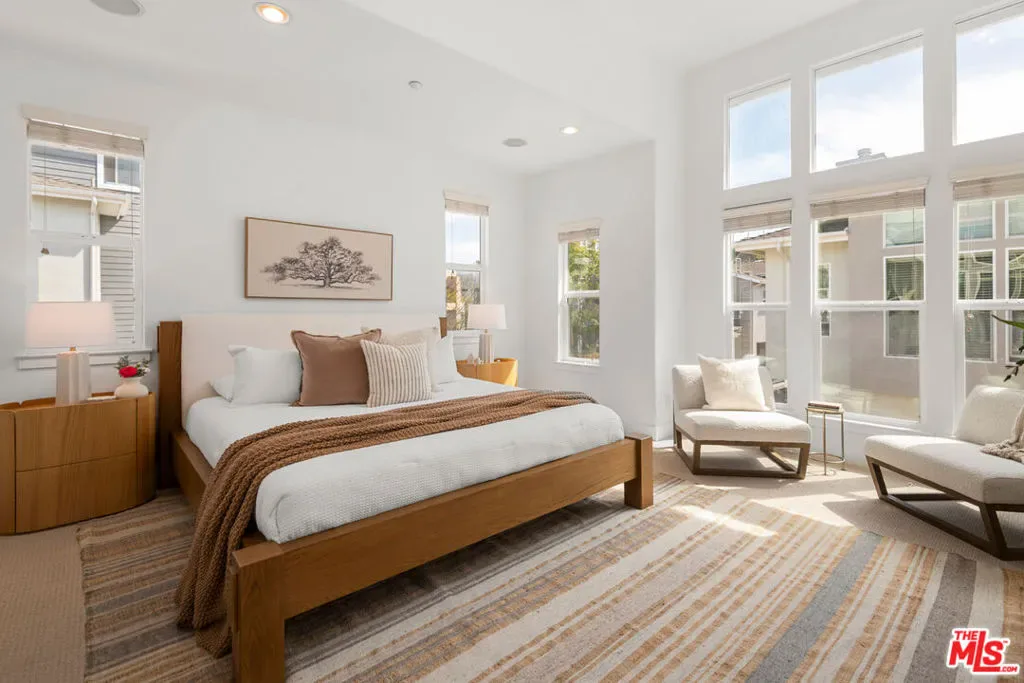 Light & bright south-facing corner townhome with private entry and private 2-car garage in desirable Tapestry II. First-floor living room features high ceilings, slate floors, fireplace, and abundant natural light. Open-concept kitchen, family, and dining area with hardwood floors, granite countertops, and stainless steel appliances, opening to a private balcony. Upstairs offers vaulted-ceiling primary suite and second bedroom filled with natural light. Primary bath with dual sinks and walk-in shower. Close to shops and restaurants. All Playa Vista amenities included Cable & Internet, Resort & Centerpointe Clubs.