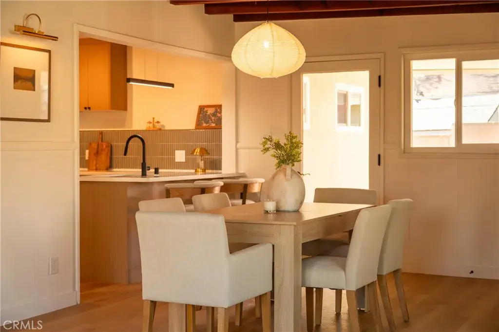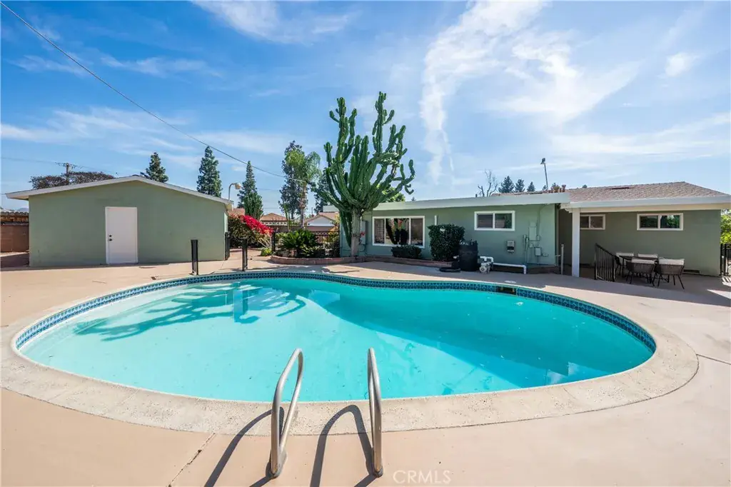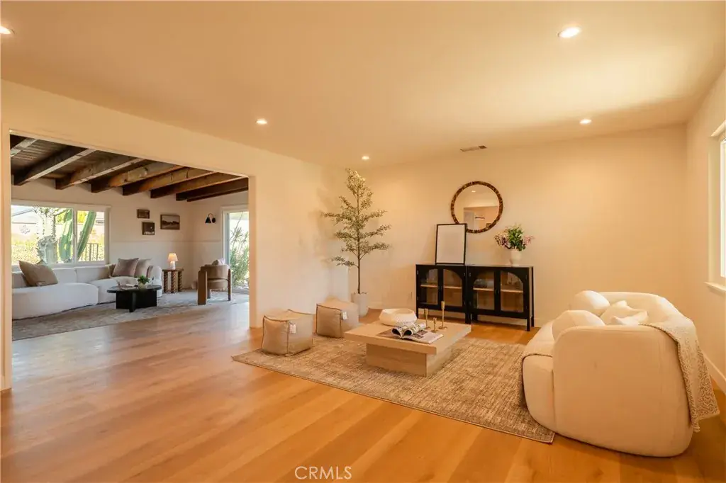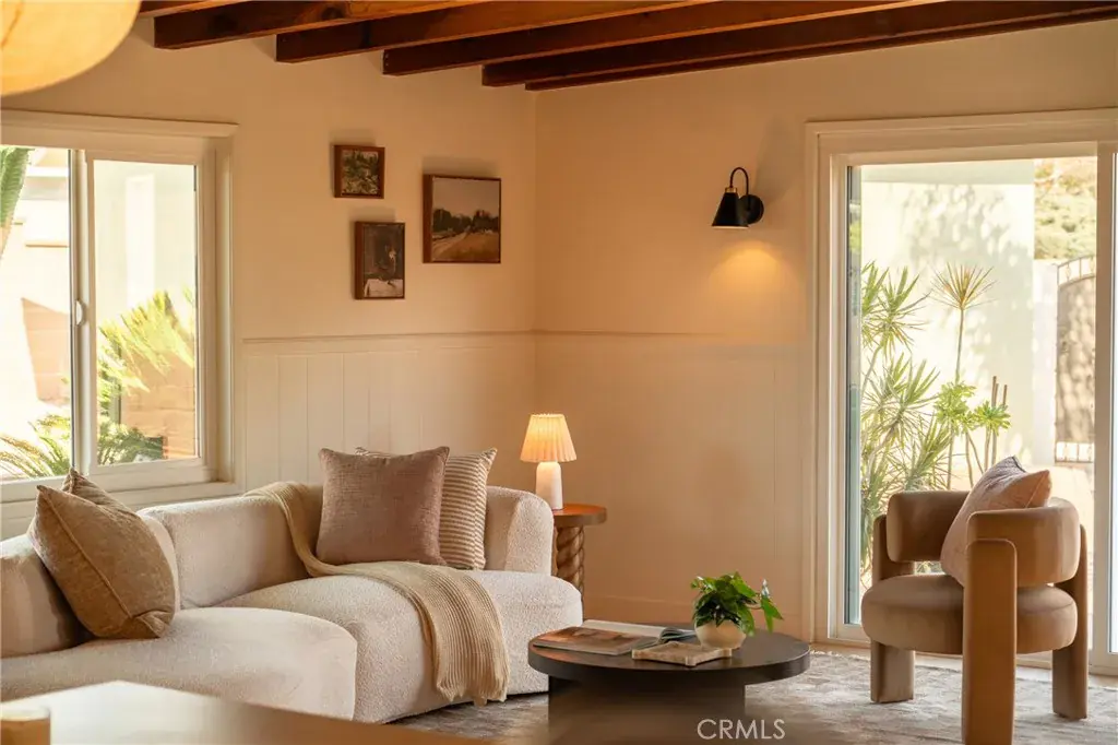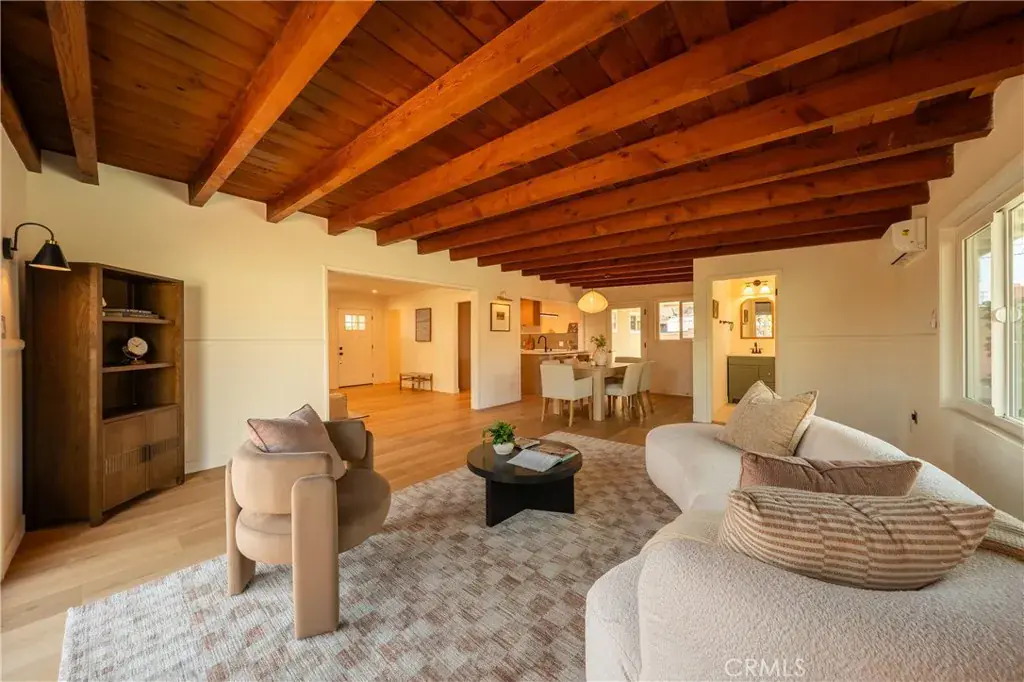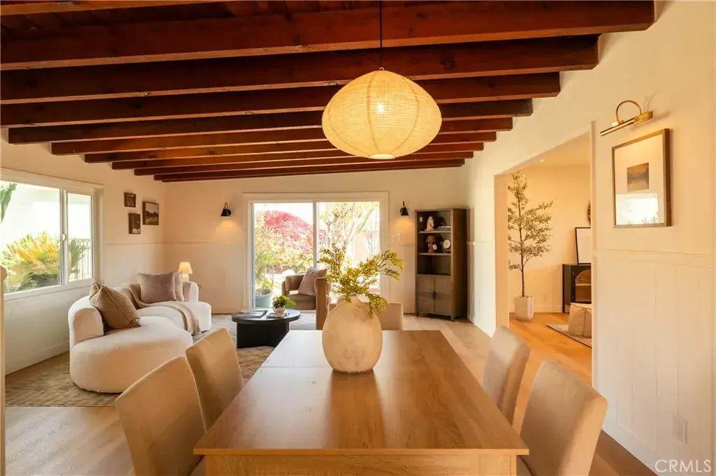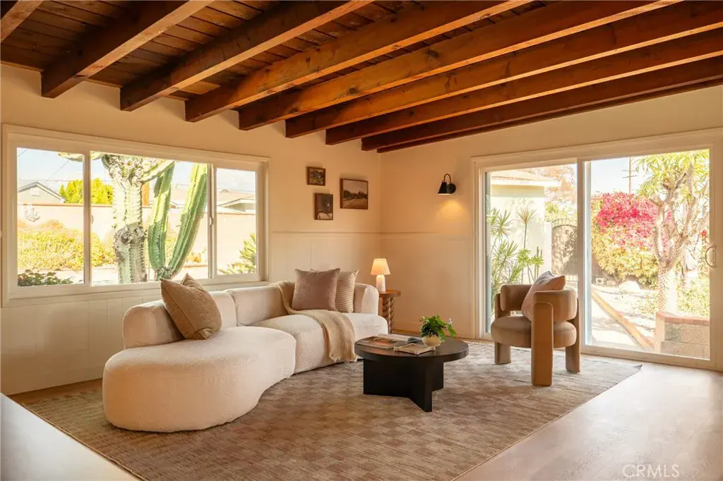 The backyard is a true private retreat. The pool has been newly replastered, and the resort-inspired outdoor setting offers generous patio space, a fire pit area, and multiple seating zones—ideal for entertaining or simply enjoying Southern California living. New dual-pane windows enhance energy efficiency, while the stunning post-and-beam ceilings preserve the home’s authentic Mid-Century character and distinctive architectural appeal.