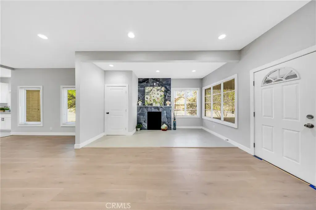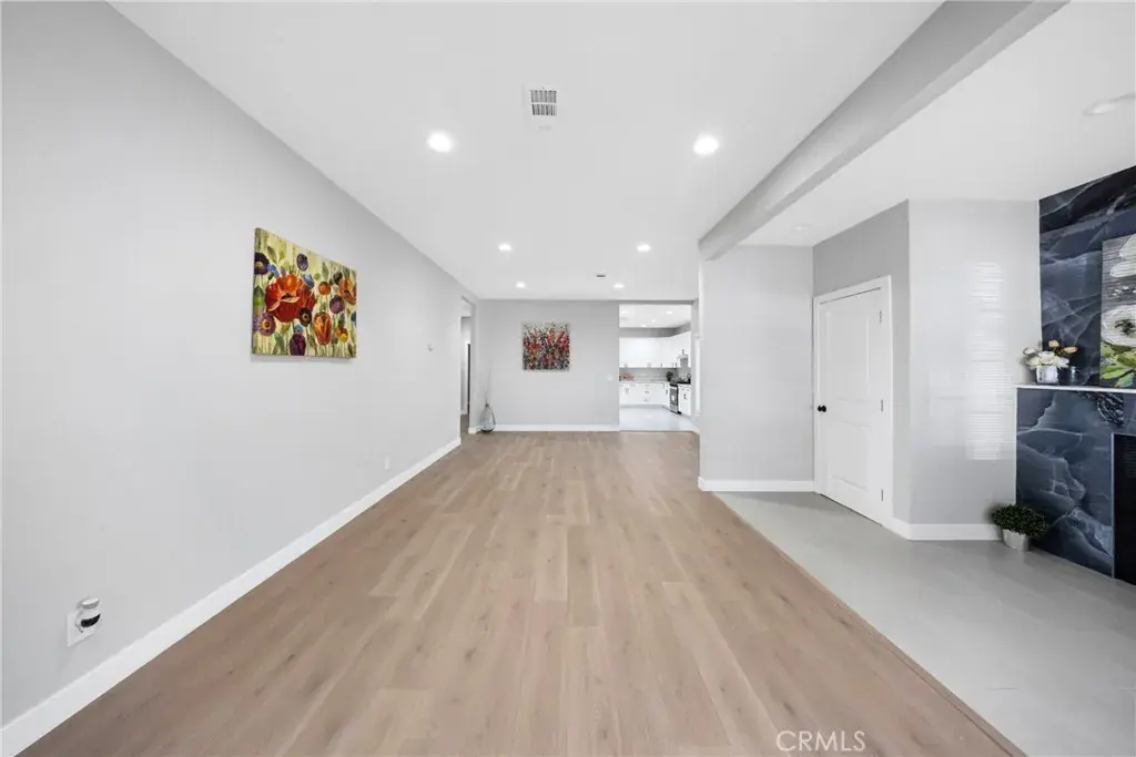 The living area is open and bright with plenty of recessed lighting. There are modern tiles and wood floors throughout.