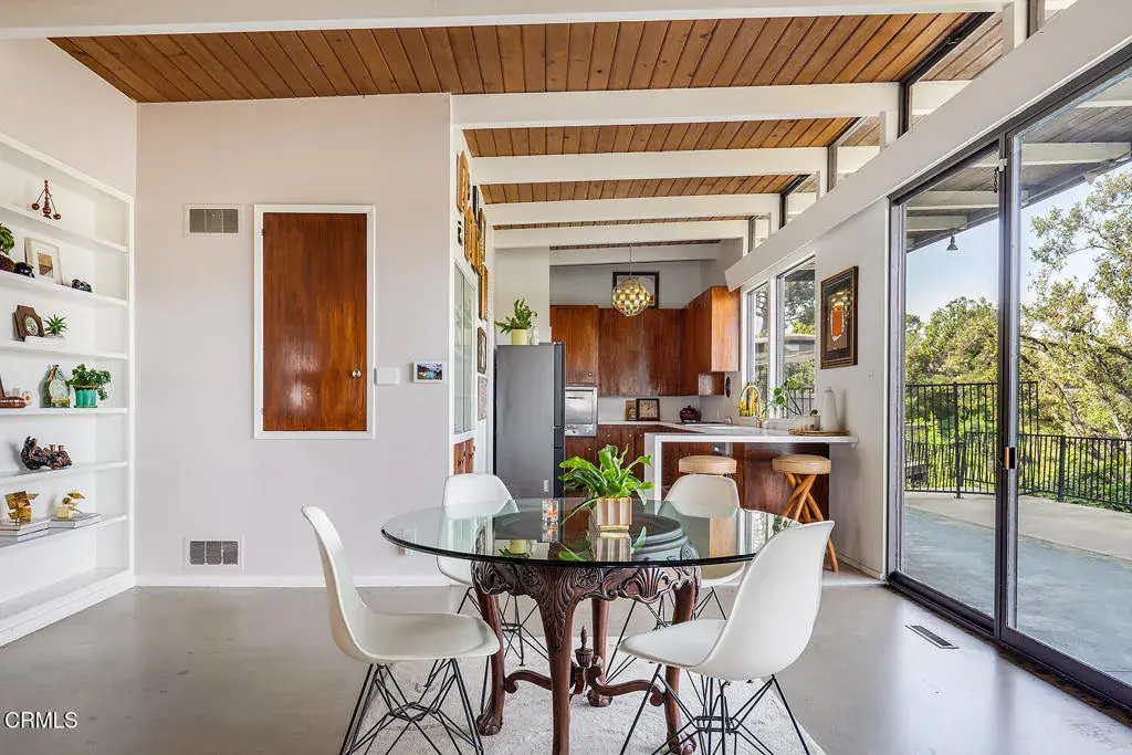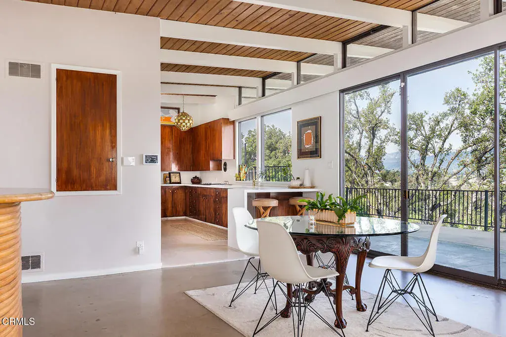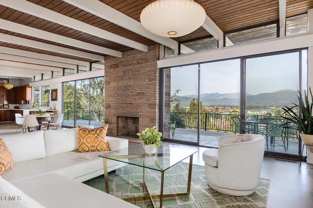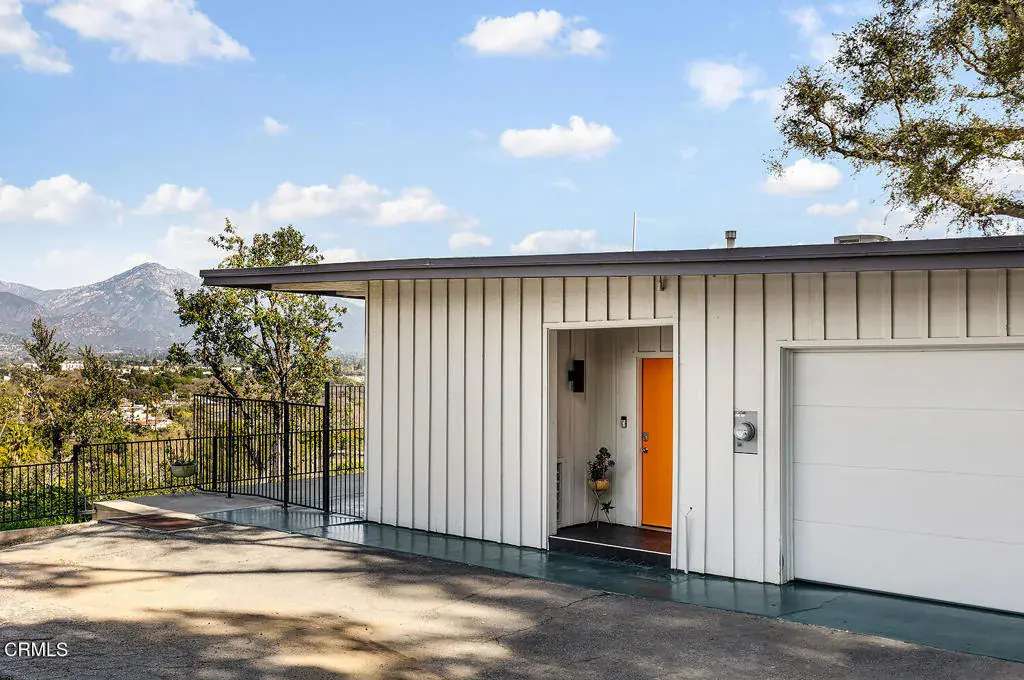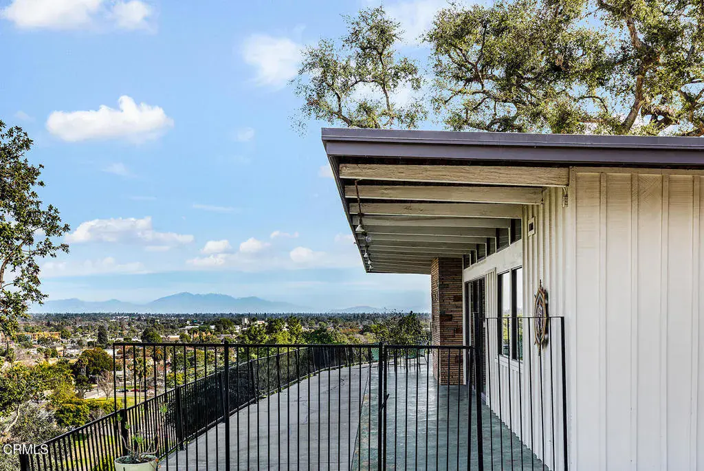 Views! Perched in Pomona’s desirable Ganesha Hills neighborhood, this gorgeous Mid Century Modern home is sited on an expansive, scenic lot. Surrounded by mature oak trees, the property offers privacy and sweeping, unobstructed views of the city and the San Gabriel Mountains. Just minutes from downtown Pomona, the Claremont Colleges, and the 10 Freeway, the location combines scenic foothills living with convenient access to nearby amenities. Inside, classic mid century architectural elements define the open plan. Tongue and groove ceilings span the living areas, complemented by exposed wooden beams and concrete floors. Walls of glass with clerestory windows above invite natural light while framing the panoramic views. A formal entry finished with terrazzo tiled floors reflects the home’s original architectural character. The open concept layout allows the living and dining areas to flow seamlessly, oriented toward the views and anchored by a stone, wood burning fireplace. A Nelson Bubble Pendant fixture highlights the living room, reinforcing the home’s iconic mid century aesthetic, while the kitchen retains original cabinetry, built-in storage, warm toned finishes, and a Lightolier Ribbon Chandelier, giving the home a timeless and historic feel. The primary bedroom includes a walk-in closet with custom doors, and the bath has been updated with terrazzo tiled floors, double sinks, custom cabinetry, a walk-in shower, and refined wall finishes. A spacious basement provides flexible additional space that may be used for storage, office space, or future customization. Outside, the exterior showcases classic board and batten siding. A private driveway leads to a generous lot with a dedicated gardening area along the side of the property. A balcony stretching over 100 feet offers sweeping 220-degree views of Mount Baldy, San Jacinto Peak, and the San Gabriel Mountains, creating an ideal setting for relaxing or entertaining. Nearby attractions include Bonelli Park, the Fairplex, and local dining destinations, adding to the appeal of this special setting. This is a rare opportunity to own a classic Mid Century Modern estate in a highly desirable neighborhood, with sweeping views and a convenient location.