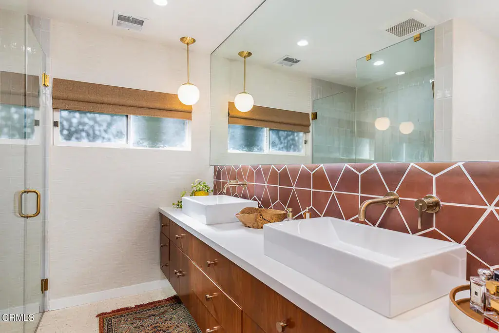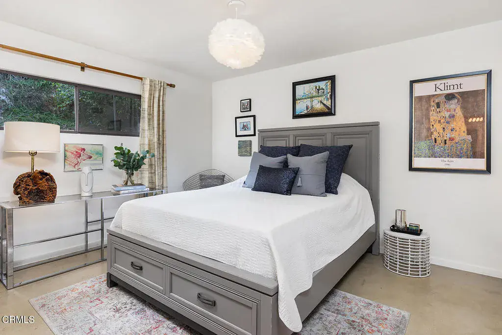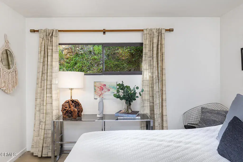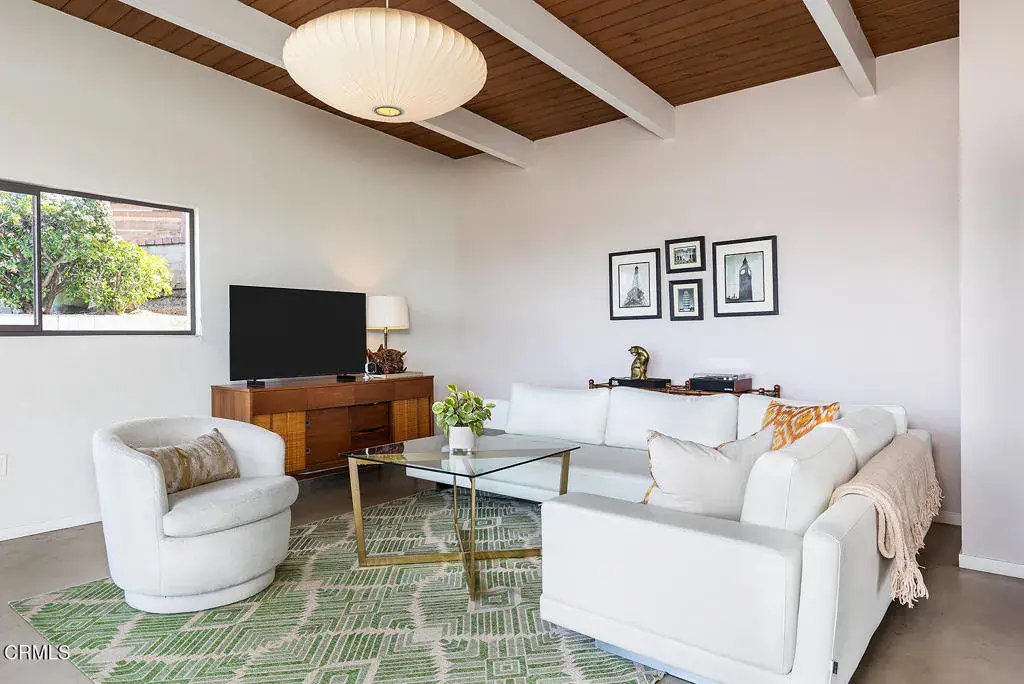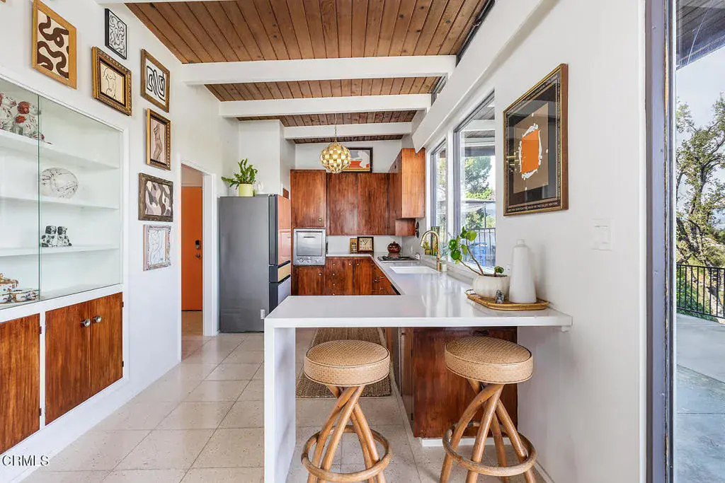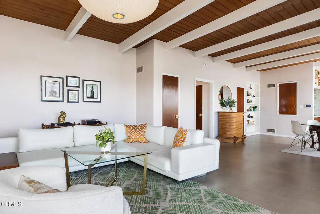 Views! Perched in Pomona’s desirable Ganesha Hills neighborhood, this gorgeous Mid Century Modern home is sited on an expansive, scenic lot. Surrounded by mature oak trees, the property offers privacy and sweeping, unobstructed views of the city and the San Gabriel Mountains. Just minutes from downtown Pomona, the Claremont Colleges, and the 10 Freeway, the location combines scenic foothills living with convenient access to nearby amenities. Inside, classic mid century architectural elements define the open plan. Tongue and groove ceilings span the living areas, complemented by exposed wooden beams and concrete floors. Walls of glass with clerestory windows above invite natural light while framing the panoramic views. A formal entry finished with terrazzo tiled floors reflects the home’s original architectural character. The open concept layout allows the living and dining areas to flow seamlessly, oriented toward the views and anchored by a stone, wood burning fireplace. A Nelson Bubble Pendant fixture highlights the living room, reinforcing the home’s iconic mid century aesthetic, while the kitchen retains original cabinetry, built-in storage, warm toned finishes, and a Lightolier Ribbon Chandelier, giving the home a timeless and historic feel. The primary bedroom includes a walk-in closet with custom doors, and the bath has been updated with terrazzo tiled floors, double sinks, custom cabinetry, a walk-in shower, and refined wall finishes. A spacious basement provides flexible additional space that may be used for storage, office space, or future customization. Outside, the exterior showcases classic board and batten siding. A private driveway leads to a generous lot with a dedicated gardening area along the side of the property. A balcony stretching over 100 feet offers sweeping 220-degree views of Mount Baldy, San Jacinto Peak, and the San Gabriel Mountains, creating an ideal setting for relaxing or entertaining. Nearby attractions include Bonelli Park, the Fairplex, and local dining destinations, adding to the appeal of this special setting. This is a rare opportunity to own a classic Mid Century Modern estate in a highly desirable neighborhood, with sweeping views and a convenient location.