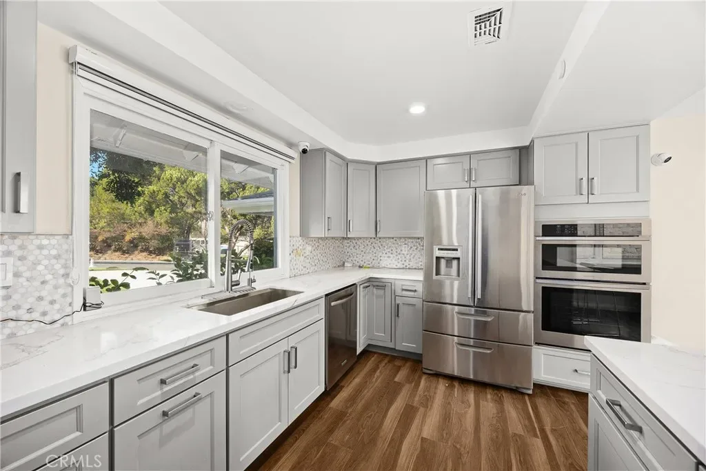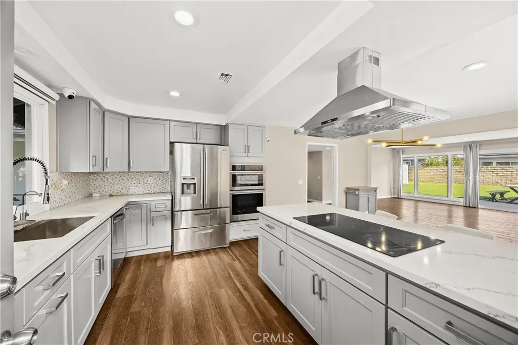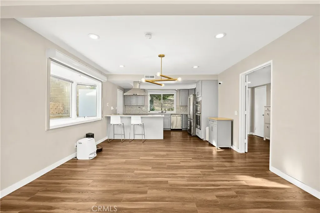 Boasting 4 bedrooms, 3 bathrooms, and 2,465 square feet of living space, this remodeled home is designed to be comfortable and welcoming. The open-concept floor plan creates a seamless flow from the modern kitchen to the backyard, perfect for entertaining or relaxing. The dining room includes a chic West Elm dining room light fixture. Large windows at the front and back of the house invite ample natural light along with recess lighting throughout the home. The primary bedroom serves as a tranquil retreat with a custom-designed closet and an elegant en-suite bathroom featuring his-and-her sinks, adding a touch of luxury to your daily routine.