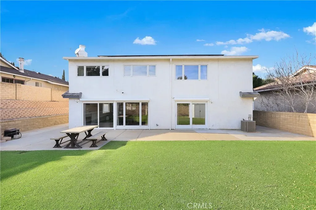 The ultra-low-maintenance front and backyard feature artificial grass. A hillside retainer wall adds character to the outdoor space.