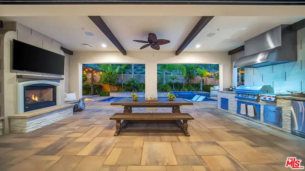This exquisite Spanish Colonial residence offers the perfect blend of timeless architecture and modern luxury, ideally situated on a private cul-de-sac with only one direct neighbor in the prestigious gated Westcliffe community of Porter Ranch. Designed with an open-concept layout, the home showcases expansive living spaces enhanced by soaring ceilings and abundant natural light. A dramatic two-story foyer creates a grand first impression, seamlessly flowing into the great room, formal dining area, and effortless indoor-outdoor living. The gourmet chef’s kitchen is the heart of the home, featuring a custom granite island, upgraded cabinetry, premium Wolf and Sub-Zero appliances, a designer hood, and a spacious walk-in pantry. A fully equipped butler’s kitchen also appointed with a Wolf range and hood and matching granite finishes adds exceptional convenience and versatility, ideal for entertaining or multi-generational living. Upgraded sliding doors and windows invite abundant natural light and provide seamless access to the backyard. Premium flooring runs throughout, with minimal carpet limited to the main staircase. The luxurious primary suite offers a private retreat with high ceilings, a custom-designed walk-in closet with built-in safe, and a fully upgraded spa-style bathroom. The private balcony features an enclosed roof and its own fireplace, creating a serene indoor-outdoor escape. All secondary bedrooms are generously sized and feature their own en-suite bathrooms, while secondary bathrooms have been thoughtfully upgraded from tub configurations to elegant walk-in showers. Custom-built closets provide optimal organization. A loft, office, and main-level guest suite offer flexible living options. A custom wine room with a custom island and seating featuring a unique themed design adds a distinctive and sophisticated touch. Step outside to a resort-style backyard designed for year-round entertaining: a custom saltwater pool and oversized spa with upgraded power jets, an outdoor wood-burning pizza oven, a full BBQ area with premium appliances, a gas fire pit, an exterior gas fireplace under the patio, a dry sauna, an outdoor shower, and a basketball court all enhanced by extensive exterior lighting and a multi-zone whole-house Sonos/Integra sound system extending to the pool and yard. An organic vegetable garden, 20+ fruit trees, and a drip irrigation system complete the lush landscape, while water fountains grace both the front and rear yards. Additional upgrades include solar panels with wall battery backup, a whole-house water filtration system, two tankless water heaters, two EV chargers, a Ring camera system, upgraded alarm with monitoring, security film on all downstairs windows, custom blinds throughout, upgraded chandeliers (including a motorized lowering system for easy maintenance), and a garage with custom storage cabinetry, overhead shelving, and smart app-controlled access. This is not just a home it is a fully realized lifestyle, impeccably upgraded and truly move-in ready, offering luxury, privacy, advanced technology, and resort-style living in one of Porter Ranch’s most sought-after communities. Ideally located just a short distance from premier amenities including Whole Foods Market, AMC Theatres, high-end dining, highly rated schools, convenient freeway access, parks, hiking trails.