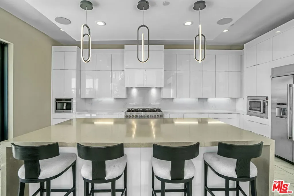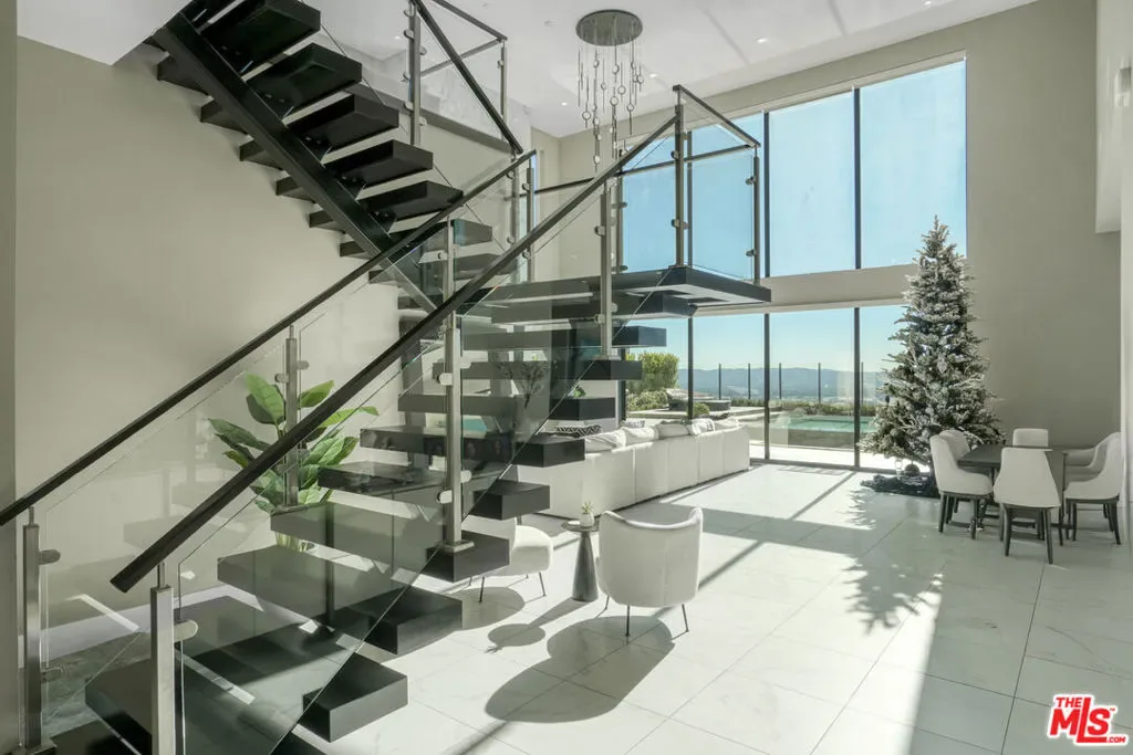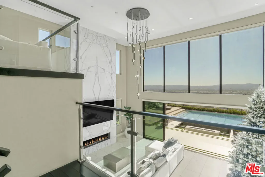 Discover this elevated modern luxury estate set within the prestigious 24-hour guard-gated community of Westcliffe in Porter Ranch Hills. Completed in 2022 and positioned on a premium view lot, this residence captures breathtaking panoramic city and mountain views from nearly every corner of the home including the Primary Suite .A dramatic solid wood and glass entry door opens to soaring 24-foot ceilings and an airy, light-filled floor plan. Expansive windows and oversized stackable doors create a seamless connection between the Great Room, the chef’s kitchen, and the outdoor living spaces, flooding the home with natural light and highlighting its sleek modern design.The gourmet kitchen features designer appliances, a large stone island, modern cabinetry, and a generous entertaining space. The main level also includes a spacious Great Room, a versatile office/media room, and a private guest bedroom with a full bath.Upstairs, the Primary Suite offers a luxurious retreat with incredible views, a spa-inspired bathroom with dual vanities, a rain shower, and a soaking tub. Four additional bedrooms and a flexible loft complete the upper level, providing ample room for family and guests. Designed for resort-style living, the backyard is an entertainer’s paradise featuring a sparkling pool and spa, a dramatic water-wall feature, a sunken fire pit, and a fully equipped outdoor kitchen with stainless-steel BBQ. Multiple dining and lounging areas, surrounded by manicured landscaping, create the perfect setting for gatherings or private relaxation.Additional highlights include solar panels OWNED , high-end finishes throughout, and a three-car garage, rounding out the home’s exceptional functionality and design.Ideally located near The Vineyards shopping center, Whole Foods, AMC, award-winning schools, and the 118 freeway, this estate offers modern luxury, elevated lifestyle, and some of the most breathtaking views in all of Porter Ranch!