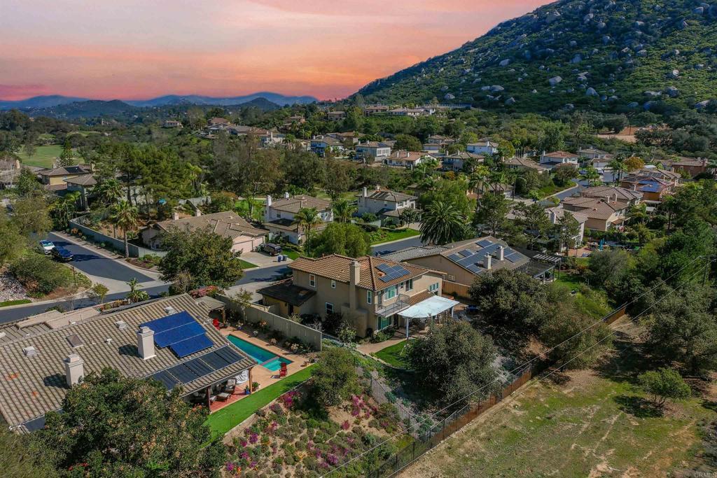 Views, upgrades, and energy savings! Enjoy spectacular sunsets and even ocean views on clear days from this beautifully upgraded Mt. Woodson home. Nearly $100K in landscaping creates a private outdoor retreat with turf, fruit trees, and an Alumawood pergola—perfect for relaxing or entertaining. Energy efficiency shines with 33 owned solar panels (with warranty) and two Tesla Powerwall batteries, currently generating an annual credit check from SDG&E. Inside features fully remodeled bathrooms, hardwood flooring upstairs and tile wood downstairs, ceiling fans in every room, and custom window shades throughout. Located in the peaceful Mt. Woodson community with convenient access to both Ramona and Poway. A rare blend of views, upgrades, and smart energy living.