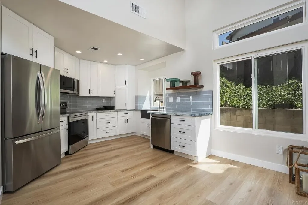 This beautifully renovated 3-bedroom, 2.5-bath canyon home has been completely transformed from top to bottom—feels just like a brand-new house. Featuring custom vinyl plank flooring, new baseboards, and all-new windows and doors throughout, every detail has been thoughtfully upgraded. beautiful low maintenance backyard looks over canyon setting with acid stained patio and new patio cover for shade and cozy nights. All bathrooms have been fully remodeled with custom tile work. The primary bath showcases a spacious double-sink vanity and a stunning walk-in shower with multiple shower heads for a spa-like experience. The brand-new kitchen is a standout, complete with custom countertops and backsplash, a farmhouse sink, and premium LG appliances—perfect for both everyday living and entertaining. Natural light pours into the home, highlighting vaulted ceilings and multiple inviting sitting areas that overlook a ????? canyon setting. Located within the highly sought-after Poway Unified School District, one of the top-rated districts in the county, this home truly offers the best of comfort, style, and location.
