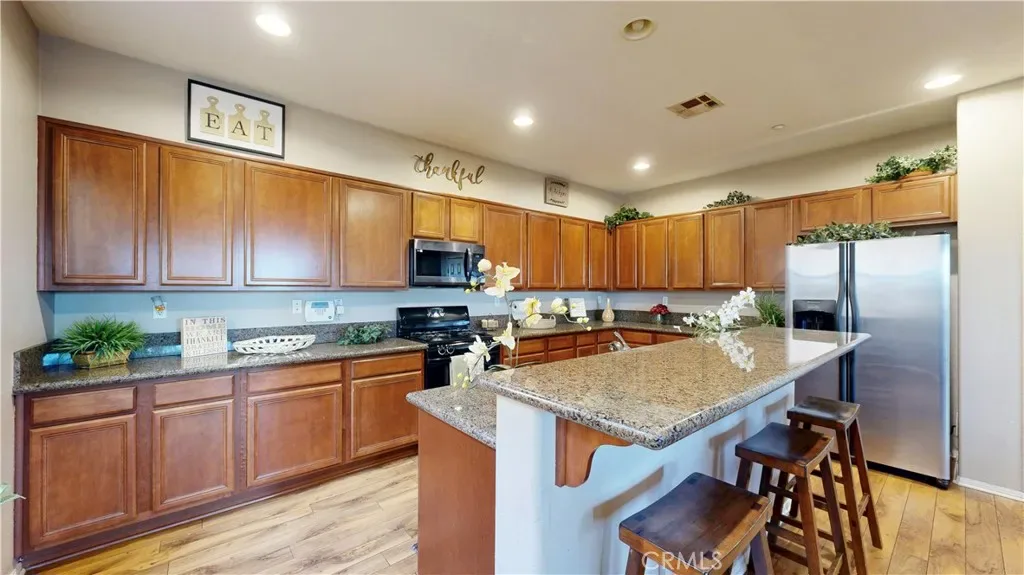 The kitchen is designed for both function and style, featuring granite countertops, abundant cabinetry, and a breakfast bar that opens to the living area, perfect for casual meals or hosting. Upstairs, you’ll find three spacious bedrooms, including a generously sized primary suite that easily accommodates a king-sized bed. The suite includes a walk-in closet and a private en-suite bathroom with dual vanities, a soaking tub, and a separate shower. A conveniently located upstairs laundry area adds to the home’s thoughtful layout. Additional features include wood laminate and wood flooring, a two-car attached garage, and a water heater with a recirculating pump for near-instant hot water. The HOA enhances the lifestyle by covering the pool, grounds, water, and internet service. Guest parking is plentiful, making it easy to welcome friends and family. Ideally located near shopping, dining, and Ontario International Airport, this home combines comfort, convenience, and resort-style amenities.