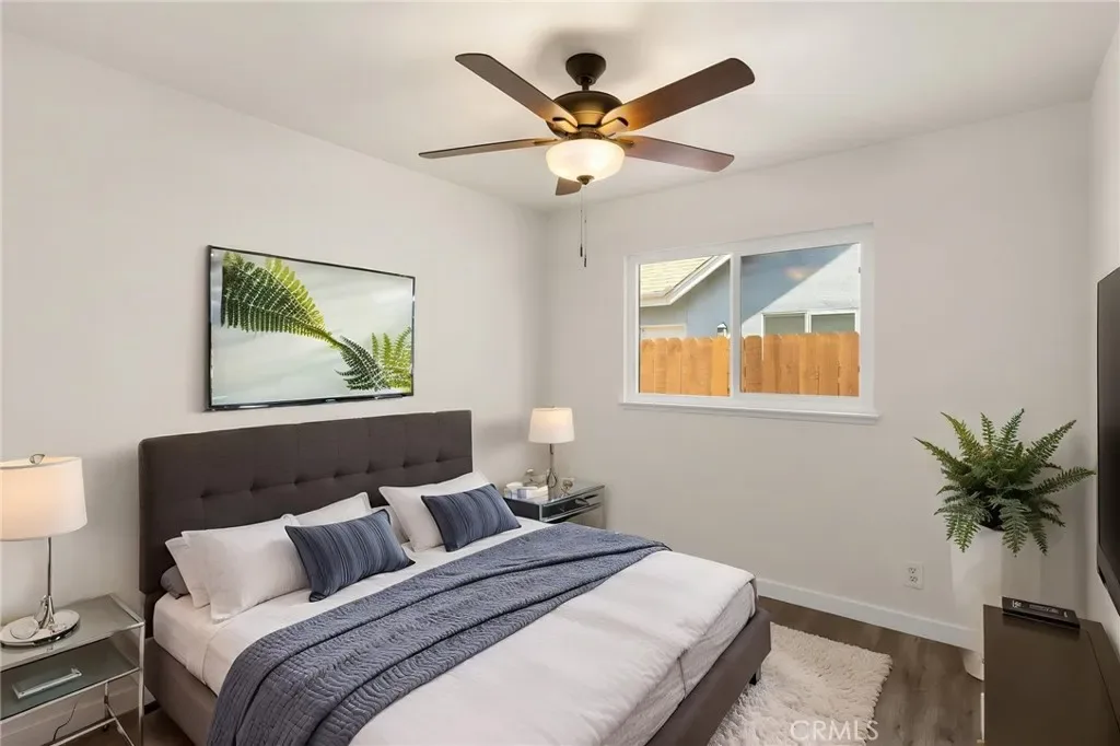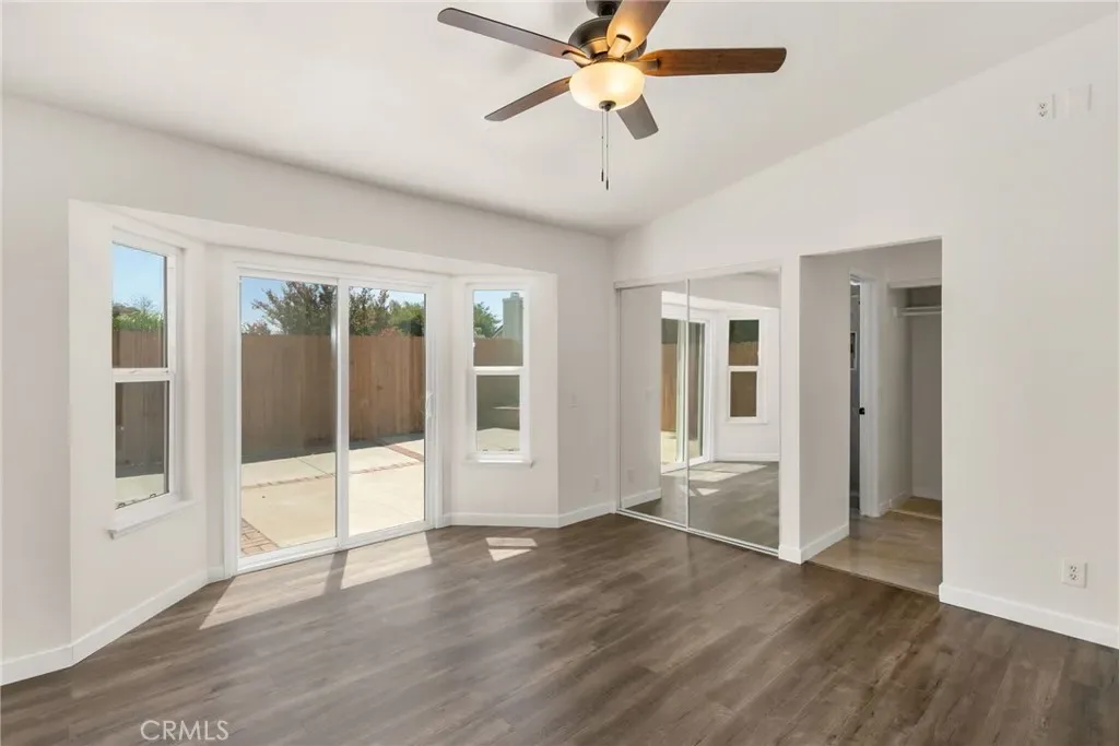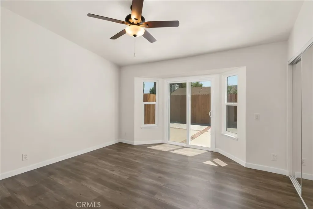 The spacious primary suite serves as a private retreat, complete with an ensuite bathroom and direct backyard access through a glass door—perfect for enjoying quiet mornings or unwinding at the end of the day. A cozy fireplace anchors the living room, while wood laminate flooring and faux wood blinds add a refined, contemporary finish throughout.