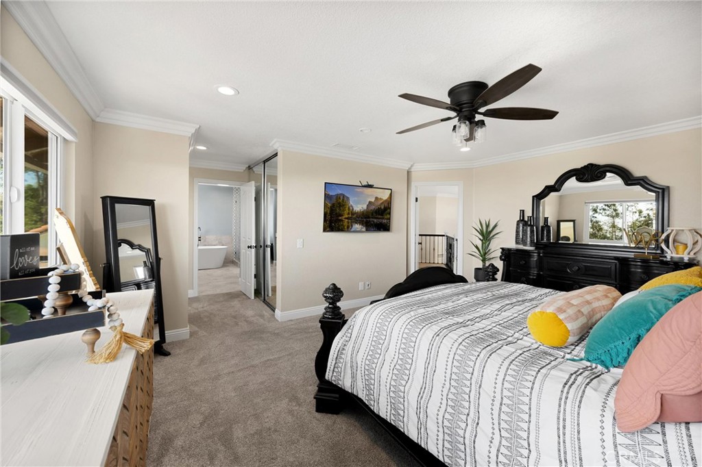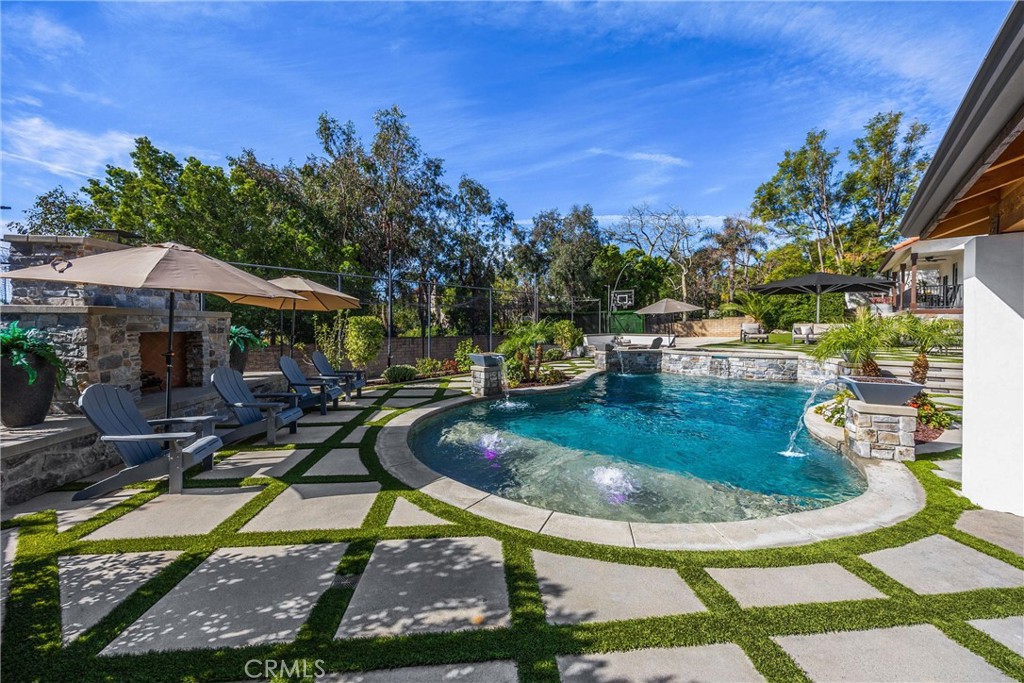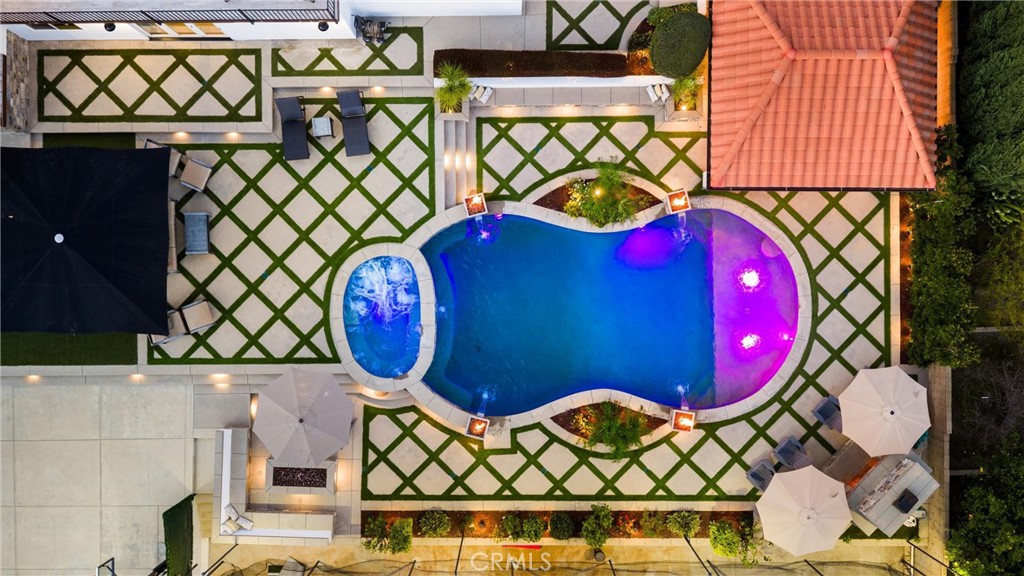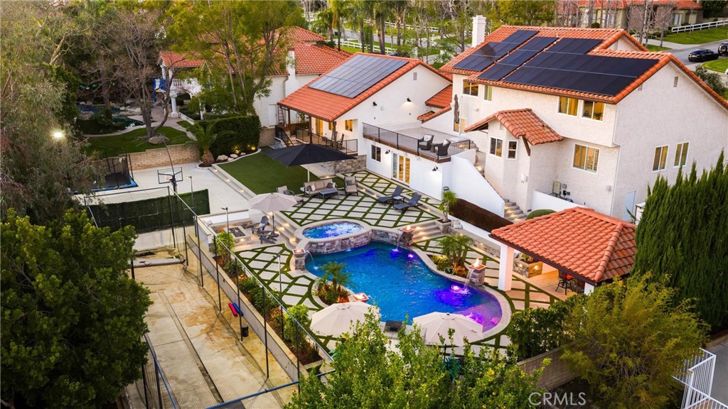 The backyard is an entertainer’s paradise, framed by incredible views. A sparkling pool with cascading waterfalls is accented by dramatic fire bowls, a fire pit, and a cozy outdoor fireplace—creating year-round ambiance. Managed by the Pentair ScreenLogic system, you can control pool features and lighting directly from your smartphone. Offering resort-style recreation at home, the backyard also features a batting cage, basketball court, and an in-ground trampoline. A covered outdoor kitchen is complete with a built-in BBQ, natural gas burners, a sink, a drop-in cooler, and commercial-grade refrigerators—perfect for effortless entertaining. Three dedicated Sonos speaker zones with wireless amps ensure the perfect soundtrack for any gathering.