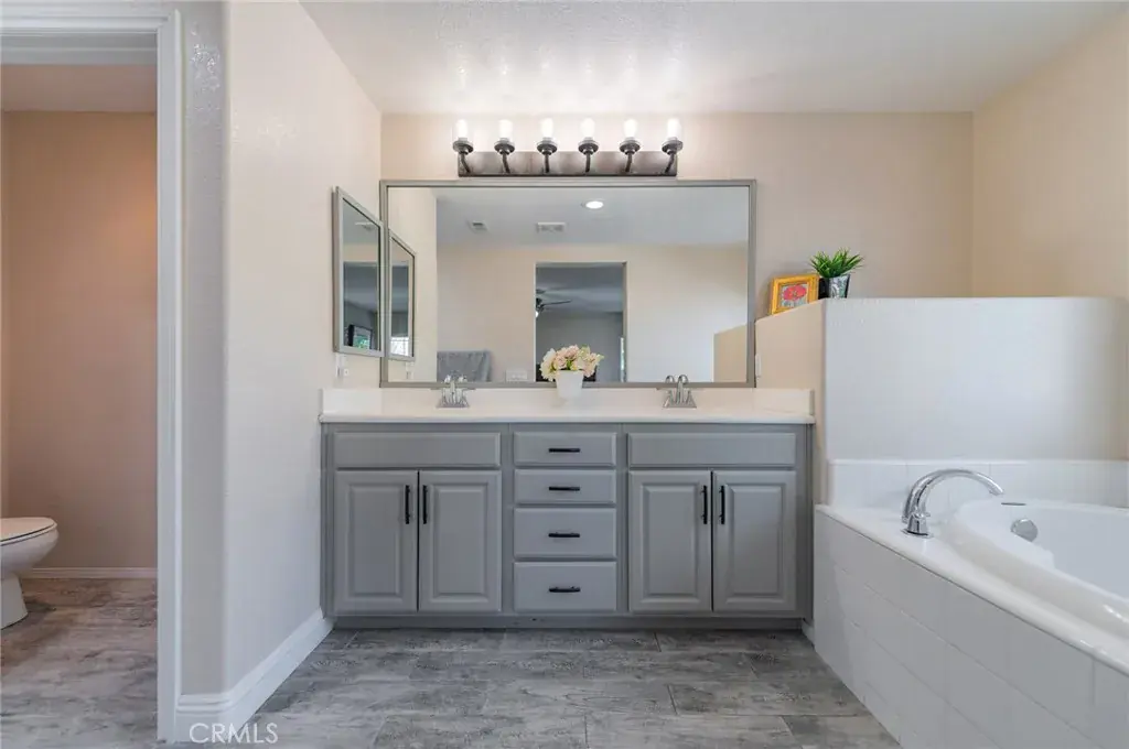 The generously sized bedrooms include mirrored wardrobe doors. The primary suite offers an oversized soaking tub, a separate walk-in shower, and a spacious walk-in closet.