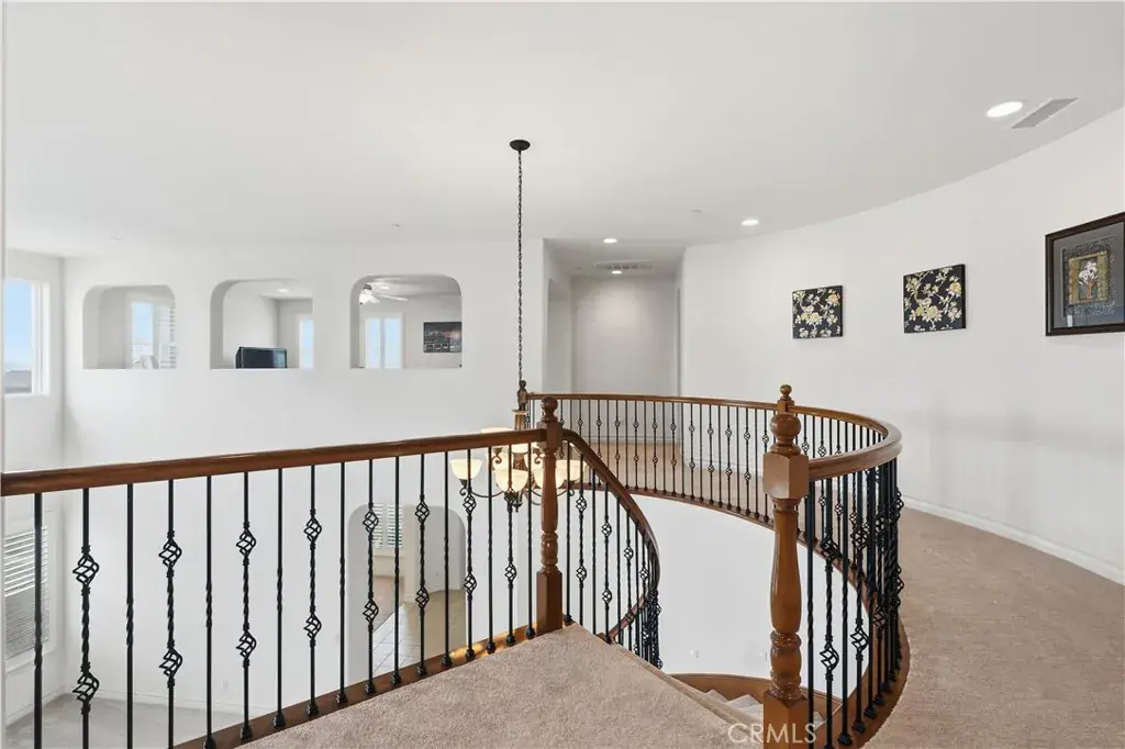 Executive 4-bedroom, 4.5-bathroom home offers 4,610 sq. ft. of spaciously designed living space in the gated community of Rancho Etiwanda Estates, located at top of Day Creek. Set on a quiet cul-de-sac, this south-facing property features sweeping snow capped mountain & city views, along with unique design elements like arches & spiral wrought iron staircase overlooking large 2-story formal living room. inspired by feng shui principles. The open-concept layout balances style & privacy, making it ideal for both daily living & entertaining.