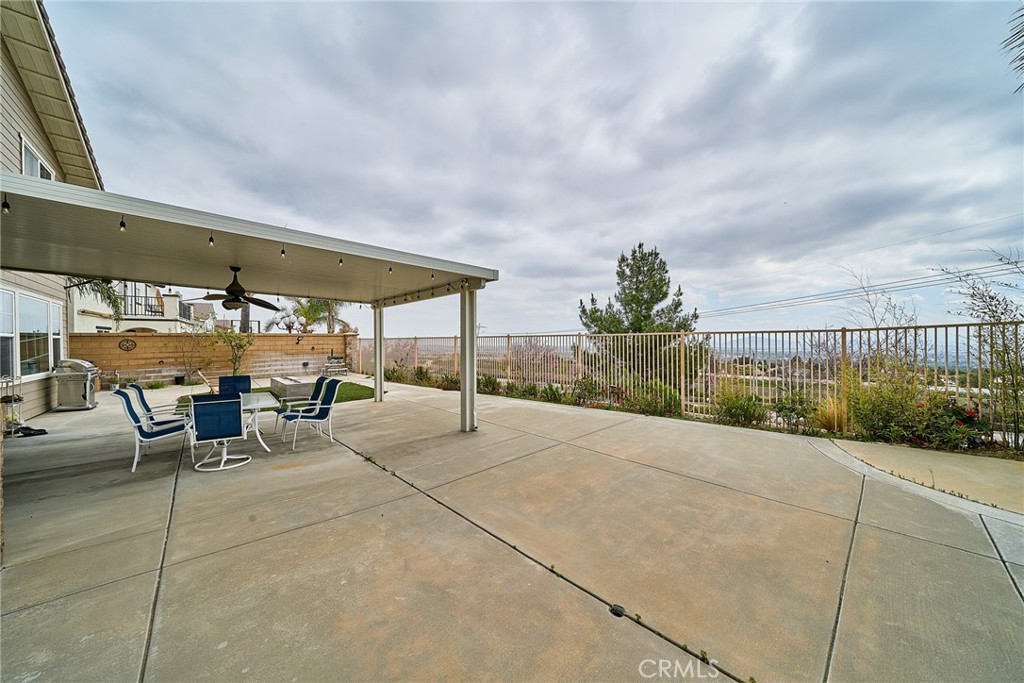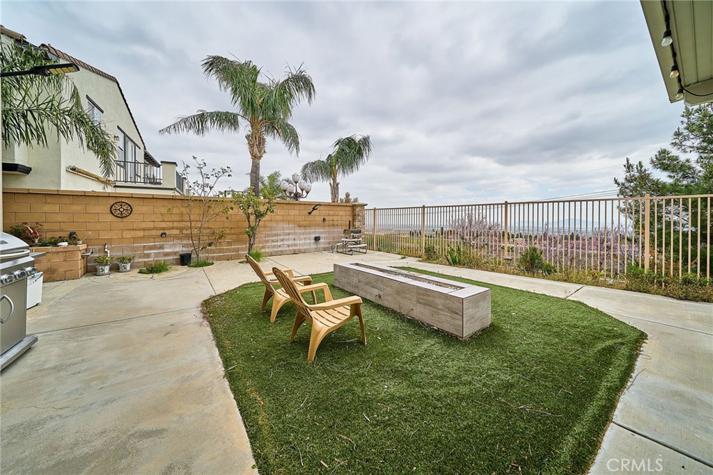 The beautifully finished backyard features a 357 sq. ft. covered patio, fruit trees, and ample space for entertaining — all complemented by sweeping foothill and city light views.