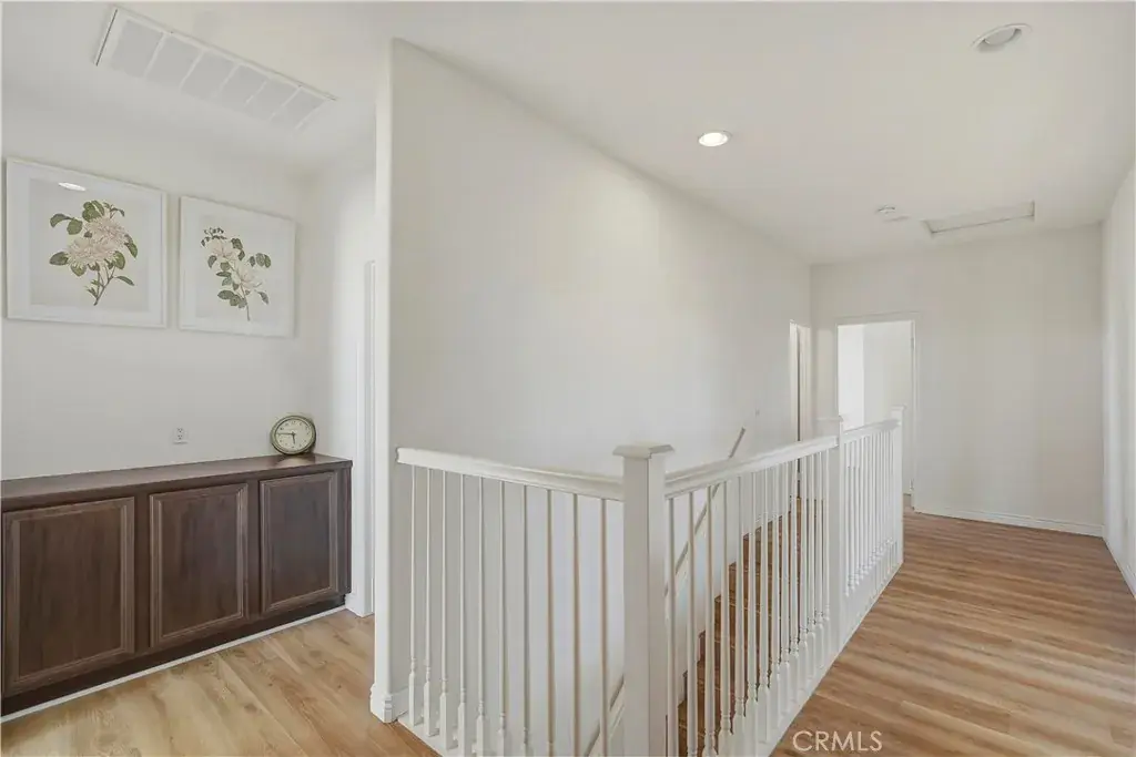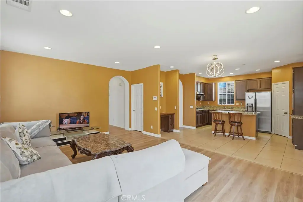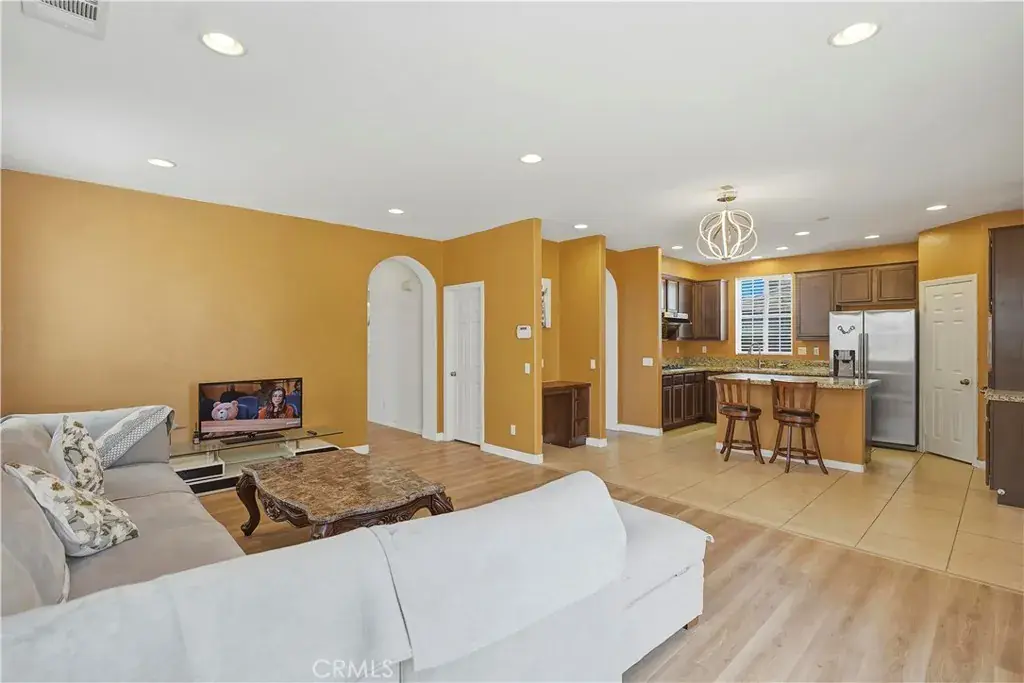 This beautifully maintained 2010-built single-family home is ideally located in one of Rancho Cucamonga’s desirable neighborhoods, within walking distance of Victoria Gardens and served by the highly regarded Etiwanda School District. A welcoming covered front porch offers a pleasant space to enjoy your morning coffee or relax in the evening.Inside, premium waterproof flooring runs throughout, creating a clean and cohesive look. The well-designed kitchen features granite countertops, rich-toned cabinetry, a center island, and an open-concept layout that flows into the family room — ideal for everyday living and entertaining. A convenient downstairs bedroom with a full bath provides flexibility for guests, multigenerational living, or a private home office. The home also features a versatile bonus room offering the flexibility of a potential fifth bedroom. Upstairs, the spacious primary suite features a dual-sink vanity, a separate tub and glass-enclosed shower, offering a comfortable and functional retreat. Additional highlights include a dedicated laundry room with built-in cabinetry and utility sink, low-maintenance landscaping, and a custom iron side gate that enhances both privacy and curb appeal.