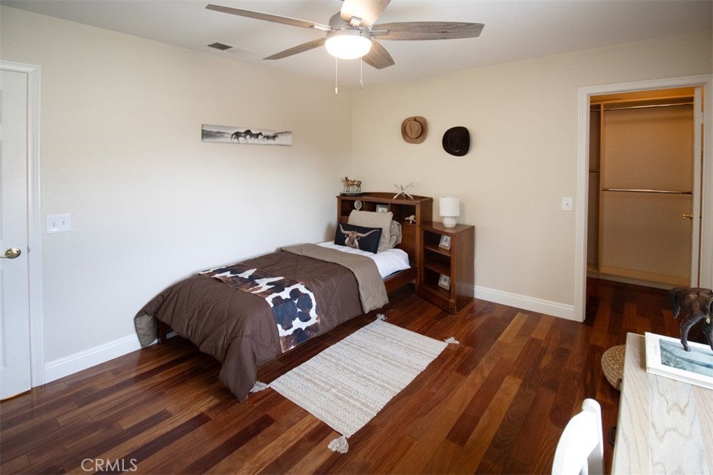 Hardwood flooring runs throughout the main living areas and is complemented by fresh interior paint, dual pane Pella windows, and thoughtful upgrades throughout the home. Each bedroom features a ceiling fan and a walk in closet with custom organizers and built in valet rods.