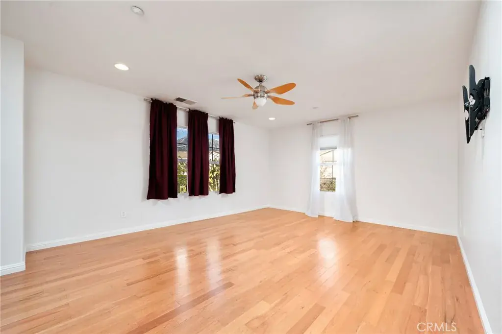 Great Location! Move-in ready Freshly painted 4-bedroom condo in the most desirable Brighton Etiwanda area, part of the award-winning Etiwanda School District. Upstairs are three bedrooms. The master bedroom has a walk-in closet with built-in cabinets, and the 2nd room has a balcony with amazing mountain views overlooking the park area. Downstairs is a room that can serve as an office, bedroom, or game room. This must-see condo has hardwood flooring and porcelain tile throughout. The open kitchen includes stainless steel appliances and granite countertops. Laundry room upstairs. The community offers a pool, spa, BBQ areas, park, and beautiful landscaping. Very close to amazing Victoria Gardens. A must-see!