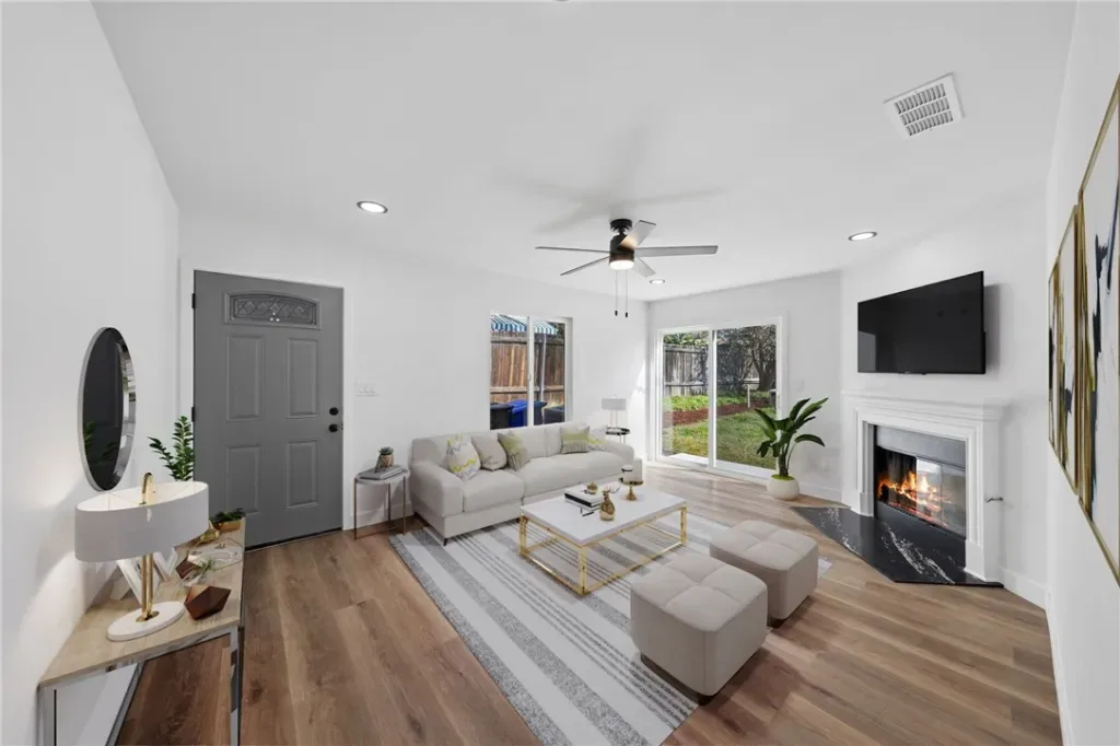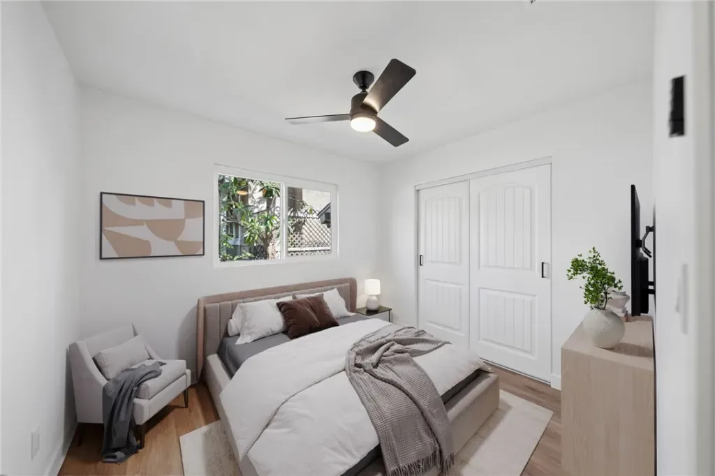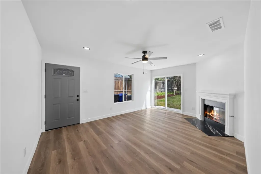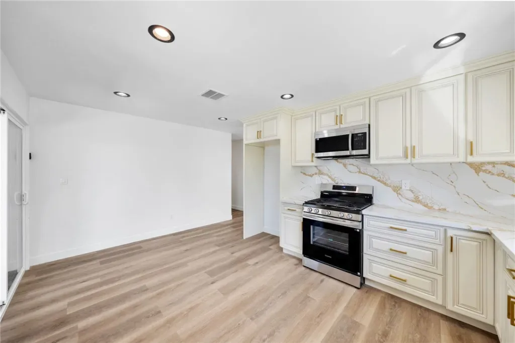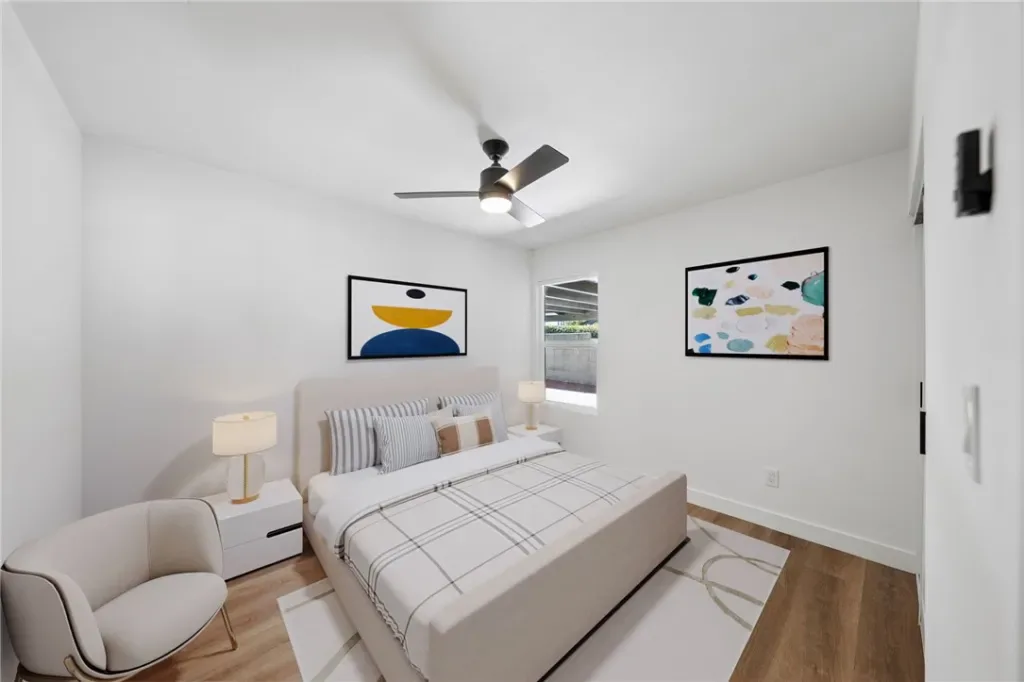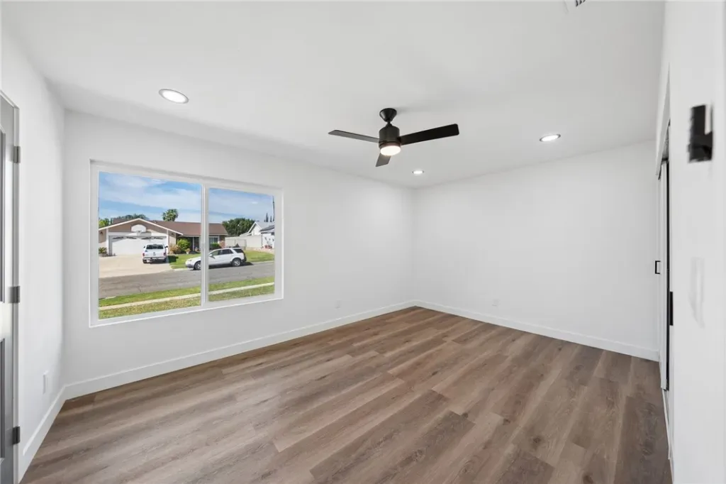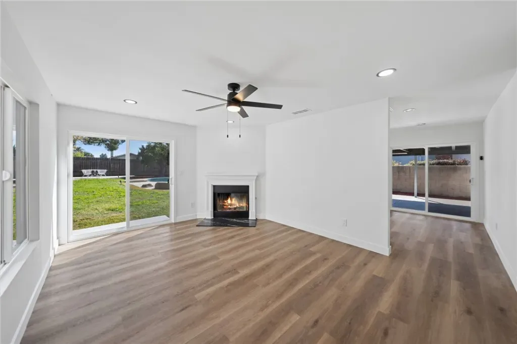 Beautifully remodeled single story pool home with an ADU located in the desirable city of Rancho Cucamonga. Situated on a large lot, this property offers excellent versatility for multigenerational living or rental income. Enter through the front door into a cozy living room with a fireplace and sliding glass door that opens to the backyard, showcasing lush landscaping and a sparkling pool. Adjacent to the living room is the upgraded kitchen featuring quartz countertops, oatmeal colored cabinetry, a large single basin sink, and a double pane window overlooking the pool, creating a bright and inviting cooking space. The main home offers 3 bedrooms and 2 fully remodeled bathrooms with wood tone flooring throughout, ceiling fans, and closet doors in each bedroom. The upgraded bathrooms include quartz countertops, and the primary suite features a rain style overhead shower for a spa like feel.
