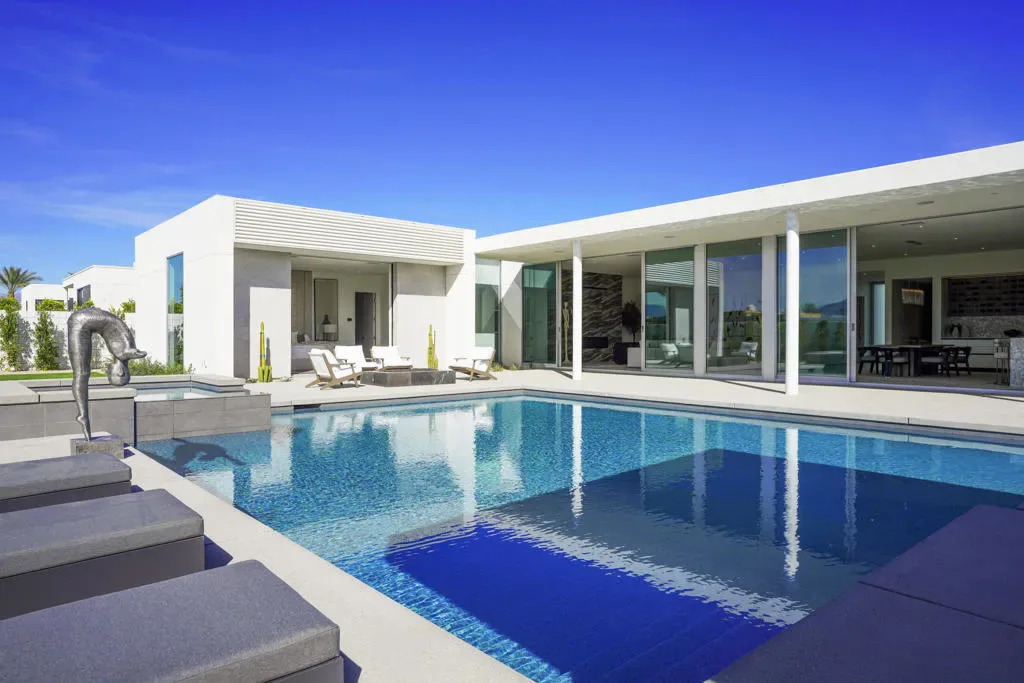 NEW CONSTRUCTION – Residence Fifteen in Linea Rancho Mirage presents the essential qualities of desert resort architecture–providing a long central pavilion with a series of flexible living spaces throughout. Our interior design team created striking classic modernist ambiance with elegant designer accents. The impressive west view home captivates drama and nature, with extensive indoor/outdoor connections, outdoor luxury living and entertaining spaces. The large plate glass hallway to the Primary Suite reinforces the cubic design thesis separating the north wing from the main house with an exciting transparent connection adding intriguing vistas to it’s surrounding desertscape throughout the residence. Exterior details are created in steel trellis work for privacy and evening light diffusion creating a stunning lit night facade; and a shade cabana appears floating gracefully along the oversized L-shape pool for gathering and making reflections of its sculptural composition. Presented by the renowned award winning builder group, Alta Verde Builders, this 4,119 square foot 4 bedroom 5 bath home is ready to become your desert oasis.