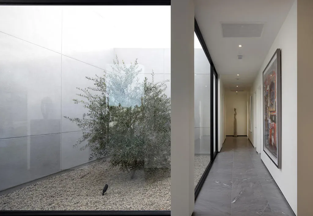 NEW CONSTRUCTION JUST COMPLETED – A stunning ultra luxury lifestyle is presented in this remarkable see-through home walled by floor-to-ceiling Fleetwood glass and doors, flanked by the front pool facing mountains west, and a reflection lap pool to the east. A glass atrium greets you at the front door, replete with a desert olive tree immediately clarifying the light, space and open architecture throughout the plan. The home circulates around the atrium providing long art hallways and glass visages of water throughout. Opposing wings provide a very private massive primary suite balanced by the guest/media rooms, all executed with precision alignments. Large format flooring, a 22 foot social kitchen island and a separate wine room, add style and features to this truly incredible modern estate.