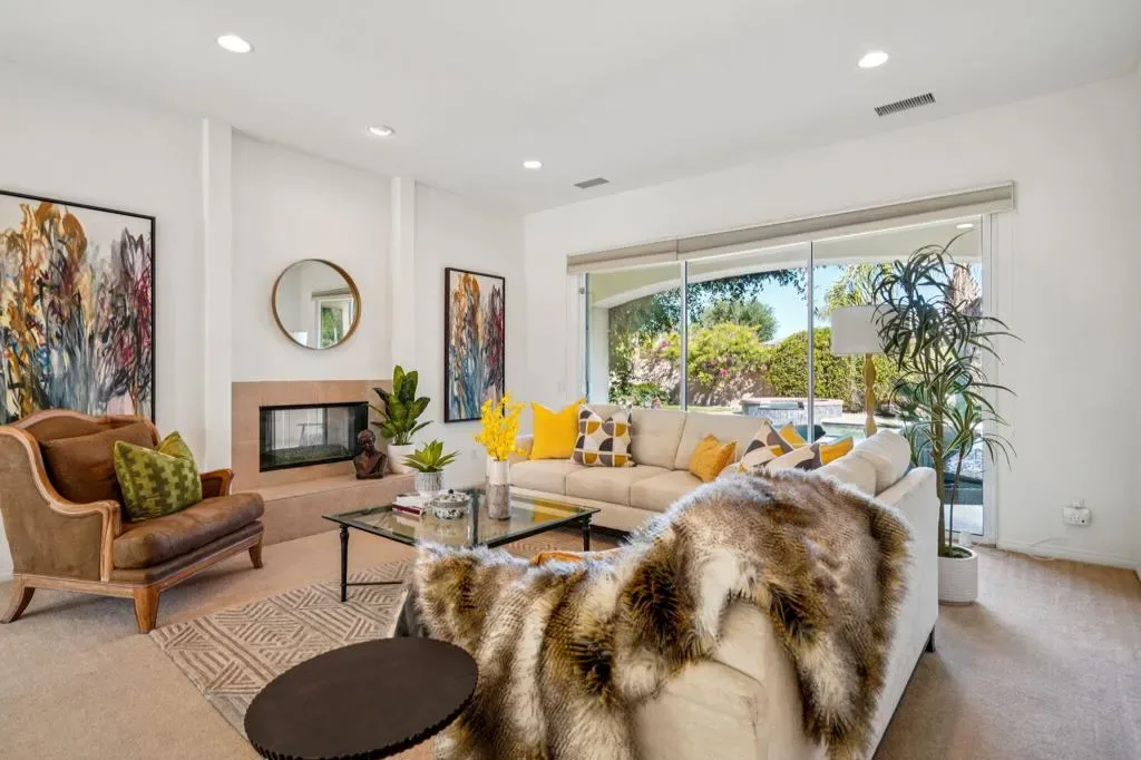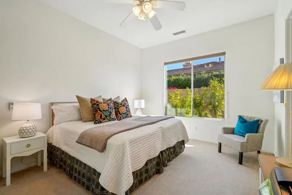 Step into refined desert living with this well-maintained 4-bedroom, 3.5-bath home complete with a private detached casita. Designed with seamless indoor-outdoor living in mind, the bright, airy layout features high ceilings and abundant natural light. A dual-sided raised-hearth gas fireplace warms both the living and family rooms, while the functional light-filled kitchen offers ample storage space with a walk-in pantry. Retreat to the expansive backyard, where a sparkling pebble-tech pool with tanning shelf, spill-over spa, and mature landscaping with lemon and orange trees create a true oasis. The separate casita provides endless versatility–ideal for guests, a home office, or multigenerational living. Additional highlights include an extended garage including built-ins and workstation with an oversized driveway to accommodate extra parking. Located within the desirable gated community of Versailles in Rancho Mirage, just moments from the El Paseo Shopping District, featuring upscale boutiques, galleries and fine dining. This home is uniquely positioned to benefit from a new wave of nearby lifestyle amenities at Cotino by Disney-restaurant and retail, a resort-style lagoon with public beach access, and a future hotel for visiting guests. Close proximity to Eisenhower Medical Center and world-class golf. Community amenities include tennis, pickleball, and basketball courts with one of the lowest monthly HOAs in the area which includes cable and high-speed internet. The property is also within the Imperial Irrigation District (IID), typically offering lower electricity costs.