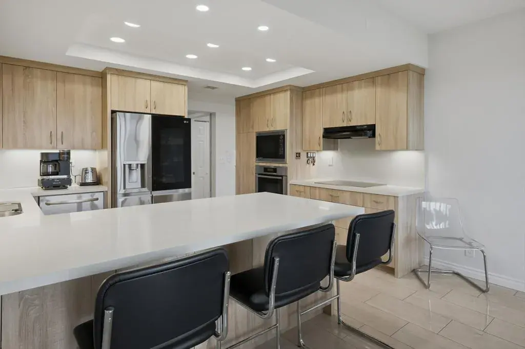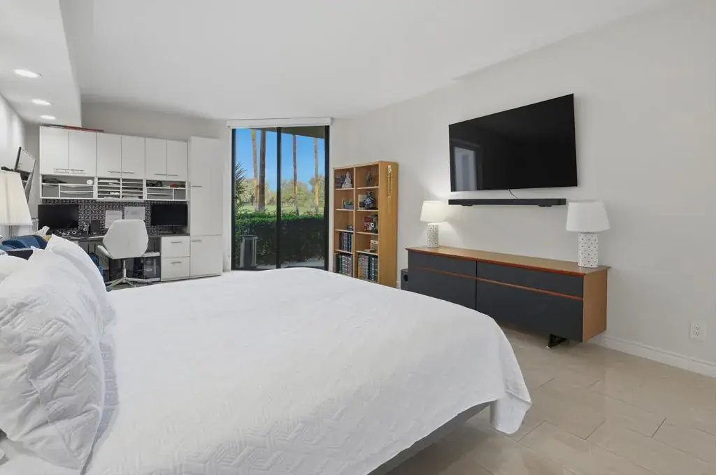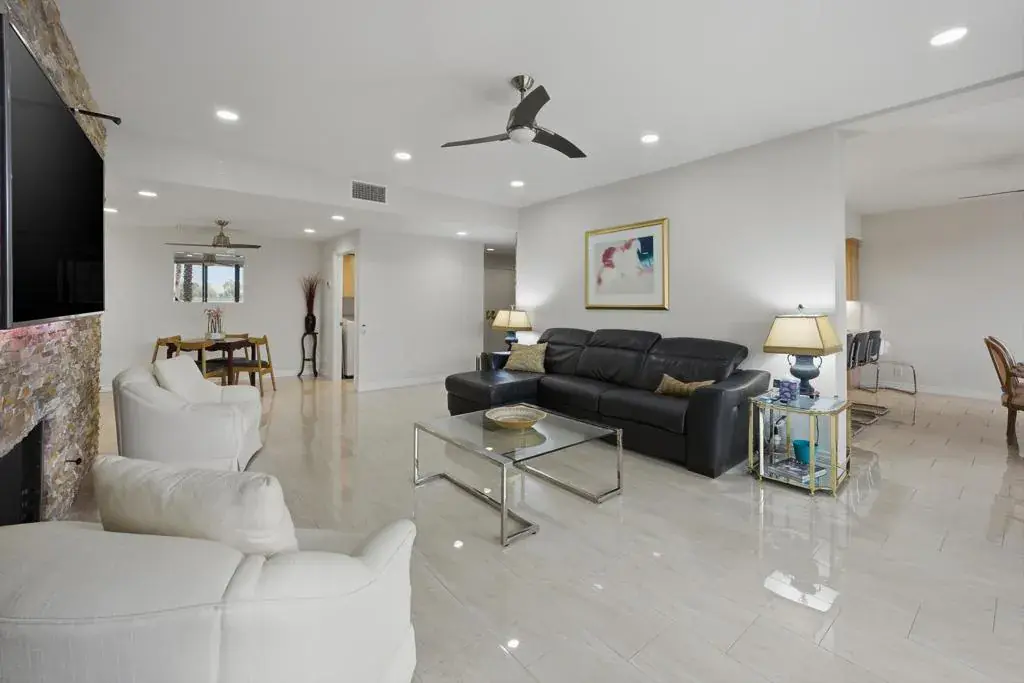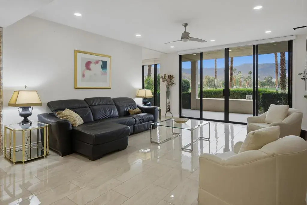 This spacious popular dual primary-bedroom suite floor plan has been completely renovated for both style and functionality. Throughout the home every room enjoys spectacular mountain views through 9-foot windows leading out to a covered terrace, ideal for relaxing. The formal entry and living room feature striking stacked stone walls and cozy gas fireplace is outfitted with dynamically backlit-70-inch LG TV. You will appreciate the many upgrades including porcelain tile flooring throughout, gorgeous kitchen featuring a convenient breakfast bar, contemporary custom cabinetry with abundant storage, beautiful quartz counters deliver a sleek modern aesthetic, built-in stainless-steel appliances, and custom lighting. The HVAC system is less than 1 year new and features a smart Nest thermostat. Additional upgrades include Kasa switches, compatible with both Alexa+ and Google, which allow for easy voice-operated control of lighting and other smart devices. Desert Island stands as a distinctive high-rise condominium community on a lush, 25-acre private island encircled by a sparkling lake and a lush green 18-hole championship golf course. Residents enjoy beautifully landscaped park-like grounds with walking paths, fruit trees, seating areas, tennis and pickleball courts, heated swimming pools and spas, pedal boats, fishing facilities, and secure 24-hour guard-gated entry. The HOA fees cover on-site management, central air-conditioning, water, gas, trash, Spectrum cable TV, Wi-Fi Internet, and the maintenance of landscaping and common areas, providing a low-maintenance, carefree lifestyle. Conveniently located close to shopping, dining, theaters, galleries, and casinos, with easy access to Eisenhower Medical Center. Schedule your showing today and discover why this home is not just a property, but a place to create lasting memories!