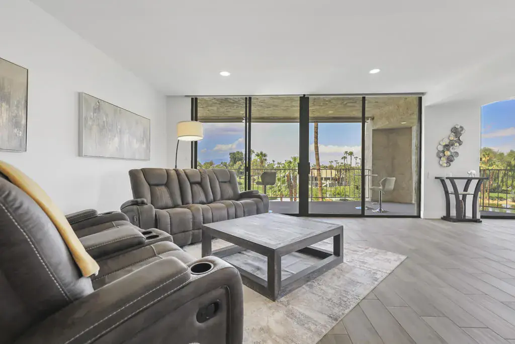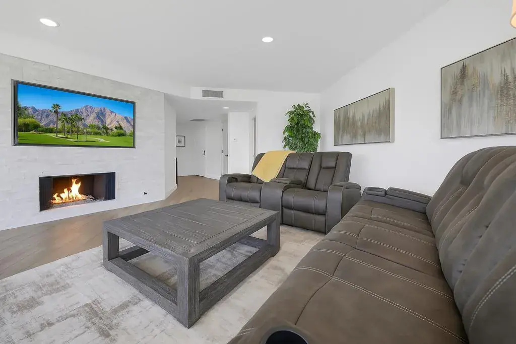 Experience elevated desert living in this beautifully reimagined Desert Island residence, offered furnished for immediate move-in ease! From the moment you step inside, walls of glass showcase stunning panoramic views of the lake, golf course, and surrounding mountains, creating a serene backdrop for everyday living. The open-concept great room is ideal for both relaxing and entertaining, complete with a sleek stacked-stone fireplace and a stylish bar. The chef’s kitchen blends function and design with quartz waterfall countertops, stainless steel appliances, white shaker cabinetry, and designer backsplash. Both bathrooms have been thoughtfully updated with modern finishes, while the primary suite offers a spa-inspired retreat featuring quartz counters, soaking tub, and custom tile work. Extending the living space outdoors, a spacious balcony runs the full length of the home — the perfect place to take in morning coffee or evening sunsets. Additional highlights include a tankless water heater and furnishings thoughtfully curated to complement the home’s contemporary design. Set within the guard-gated Desert Island community, residents enjoy resort-style amenities and a true lock-and-leave lifestyle in the heart of Rancho Mirage. This home is move-in ready and waiting to be enjoyed!