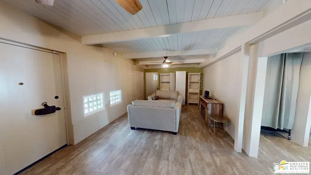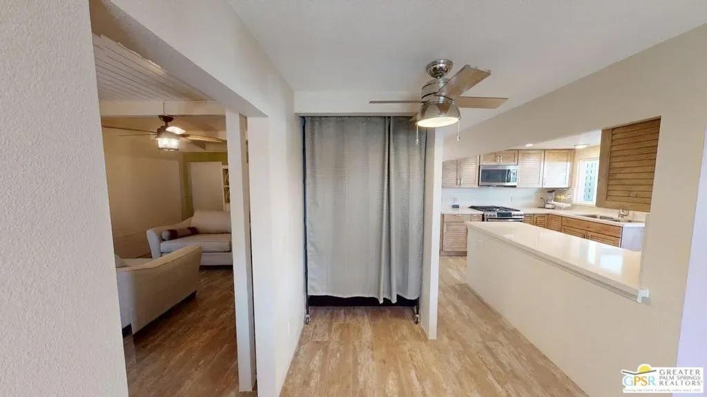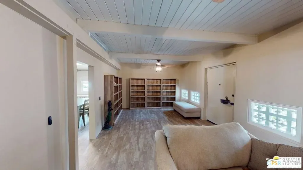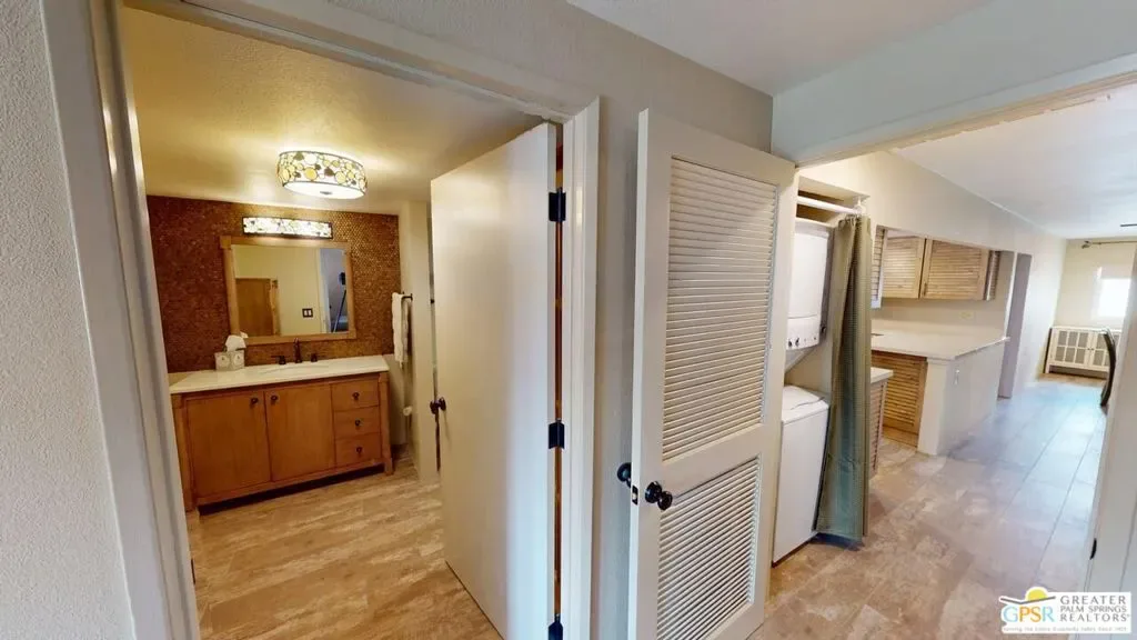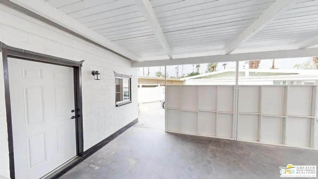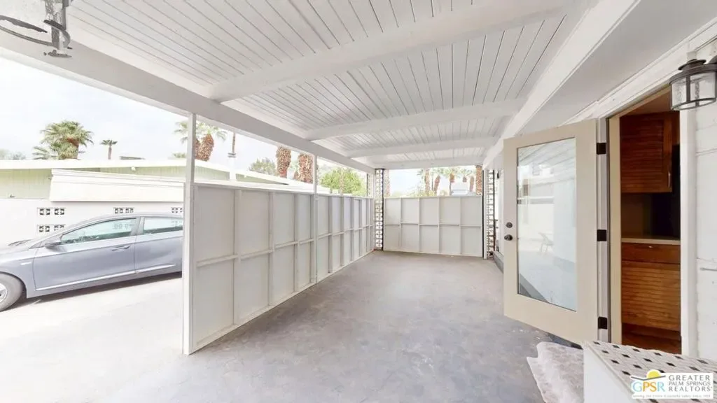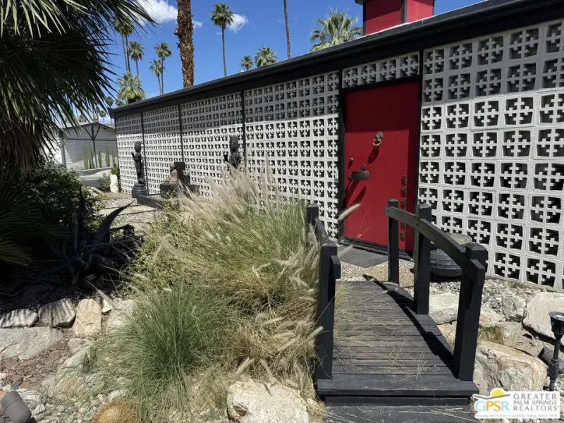 Blue Skies at it’s finest and thank you Bing Crosby for opening Blue Skies many years ago for the non – actors who wanted a lifestyle in the desert but couldn’t afford a pool home. But I digress. Here is a whimsically designed 3 Bedroom 2 Bath home and one of the bedrooms is actually an attached Casita with it’s own bath and private entrance. A 1960’s mobile home is surrounded with stick-built construction lending to it’s solid feeling and quiet interior space. Approaching this home, one can’t actually tell where the living room windows are because of the intricate concrete facade. Once inside, the living room windows are close to the floor, but with some slight upgrading, there is potential for larger windows. Forward from the living room, with built-in bookshelves, is the dining area and access to the second bedroom and then to the left is the well detailed galley kitchen with the walk-in pantry across from it. Further on is the stacked washer and dryer in it’s own closet and then beyond that is the Primary Bedroom Suite Closet and large stall shower bathroom – roll in variety. Then to the left is the primary bed chamber with direct access to the front living room. Outside the back door there is access to the Casita with it’s own entrance and bath area. There is covered carport parking and extra uncovered parking as well. Blue Skies offers a clubhouse and exercise room and the community pool and spa. Blue Skies is also close to restaurants and shopping especially on El Paseo – the Rodeo Drive of the Desert!